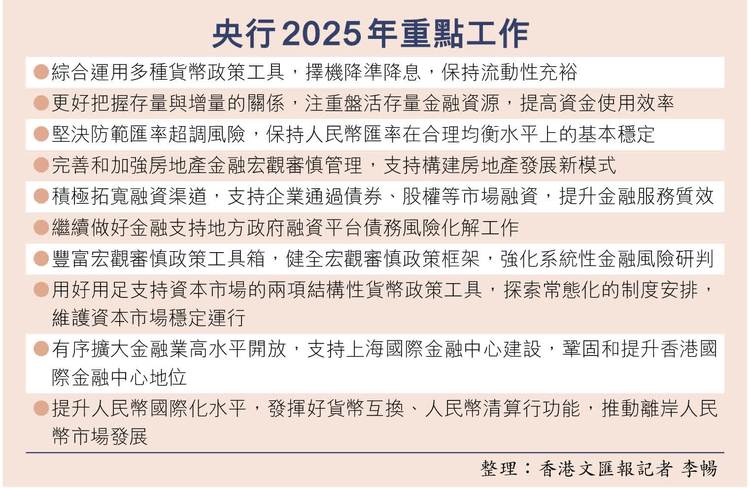 (香港文匯報 記者 李暢)據中國人民銀行官網消息,2025年中國人民銀行工作會議1月3日至4日召開,總結2024年工作,分析當前形勢,部署2025年工作。會議強調,要實施適度寬鬆的貨幣政策,擇機降準降息,保持流動性充裕、金融總量穩定增長。更好把握存量與增量的關係,注重盤活存量金融資源,提高資金使用效率。用好用足支持資本市場的兩項結構性貨幣政策工具,探索常態化的制度安排,維護資本市場穩定運行。