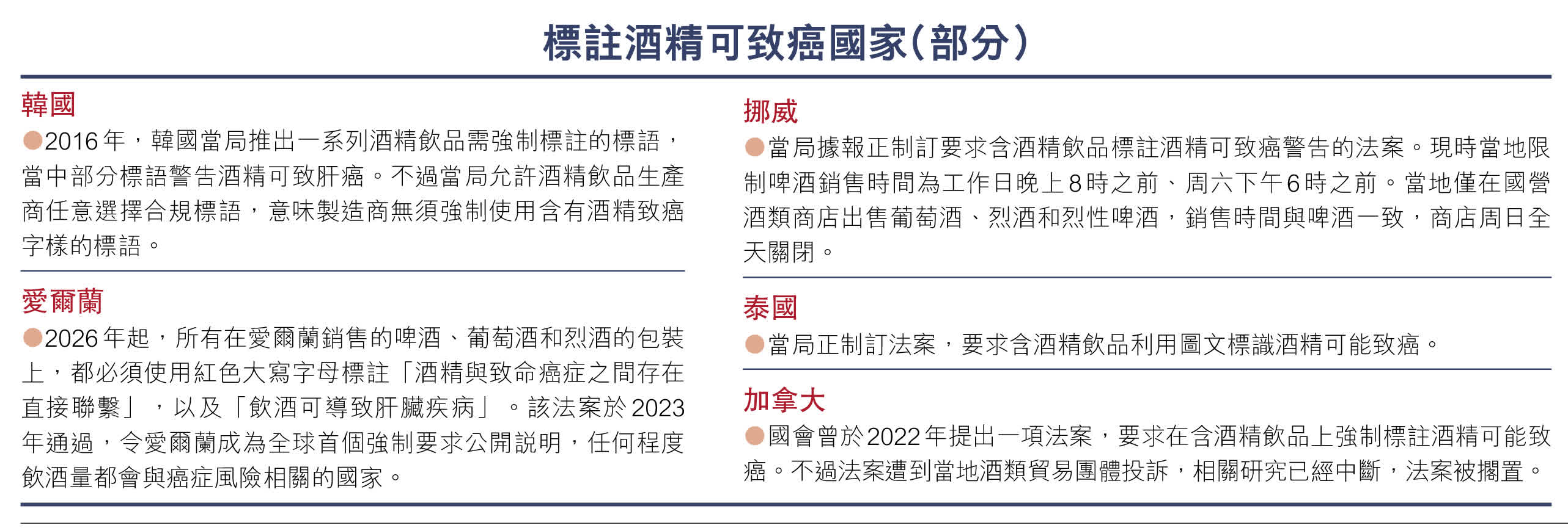 《金融時報》報道,美國公共衞生局局長穆爾蒂建議為酒精飲料添加致癌警告標籤,市場反應明顯,歐美多個酒精製造商的股價上周五(1月3日)均報跌。業界認為這意味多國政府或有意仿效控煙措施,推動飲酒率和吸煙率一樣逐步下降,可能會影響酒類飲品的銷量。