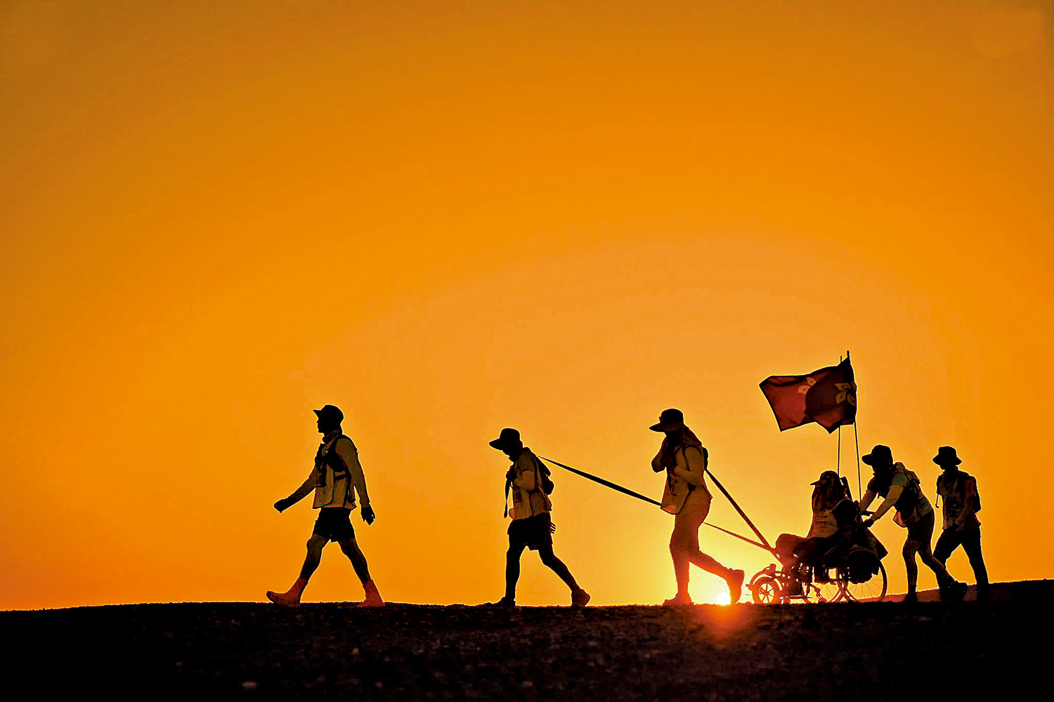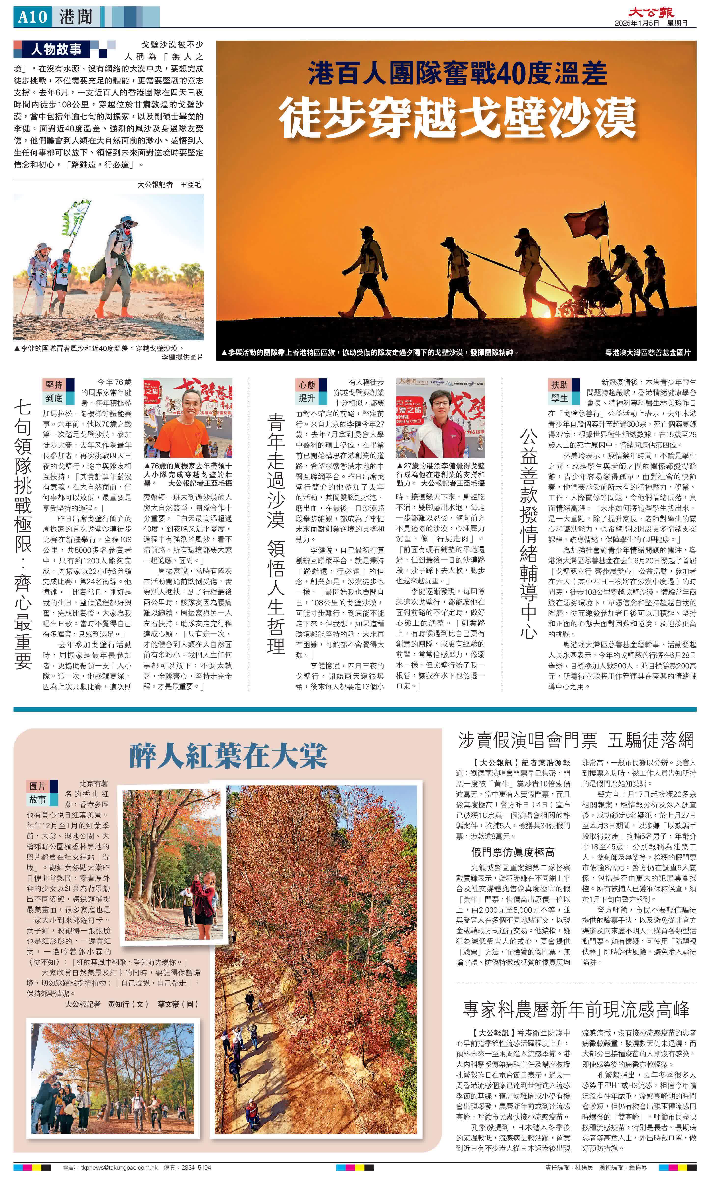 (大公報記者 王亞毛)戈壁沙漠被不少人稱為「無人之境」,在沒有水源、沒有網絡的大漠中央,要想完成徒步挑戰,不僅需要充足的體能,更需要堅韌的意志支撐。去年6月,一支近百人的香港團隊在四天三夜時間內徒步108公里,穿越位於甘肅敦煌的戈壁沙漠,當中包括年逾七旬的周振家,以及剛碩士畢業的李健。面對近40度溫差、強烈的風沙及身邊隊友受傷,他們體會到人類在大自然面前的渺小、感悟到人生任何事都可以放下、領悟到未來面對逆境時要堅定信念和初心,「路雖遠,行必達」。