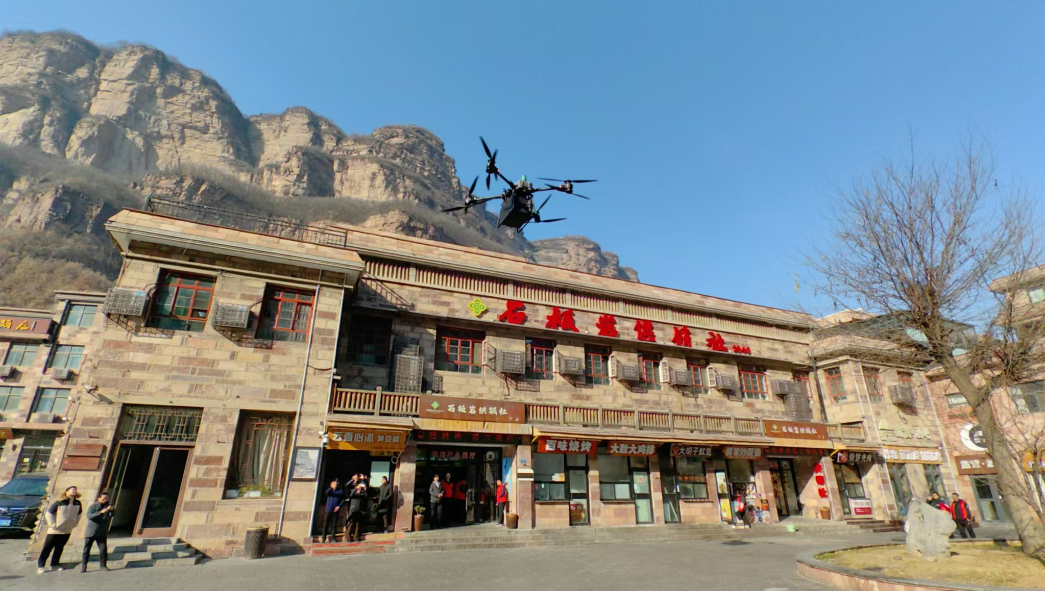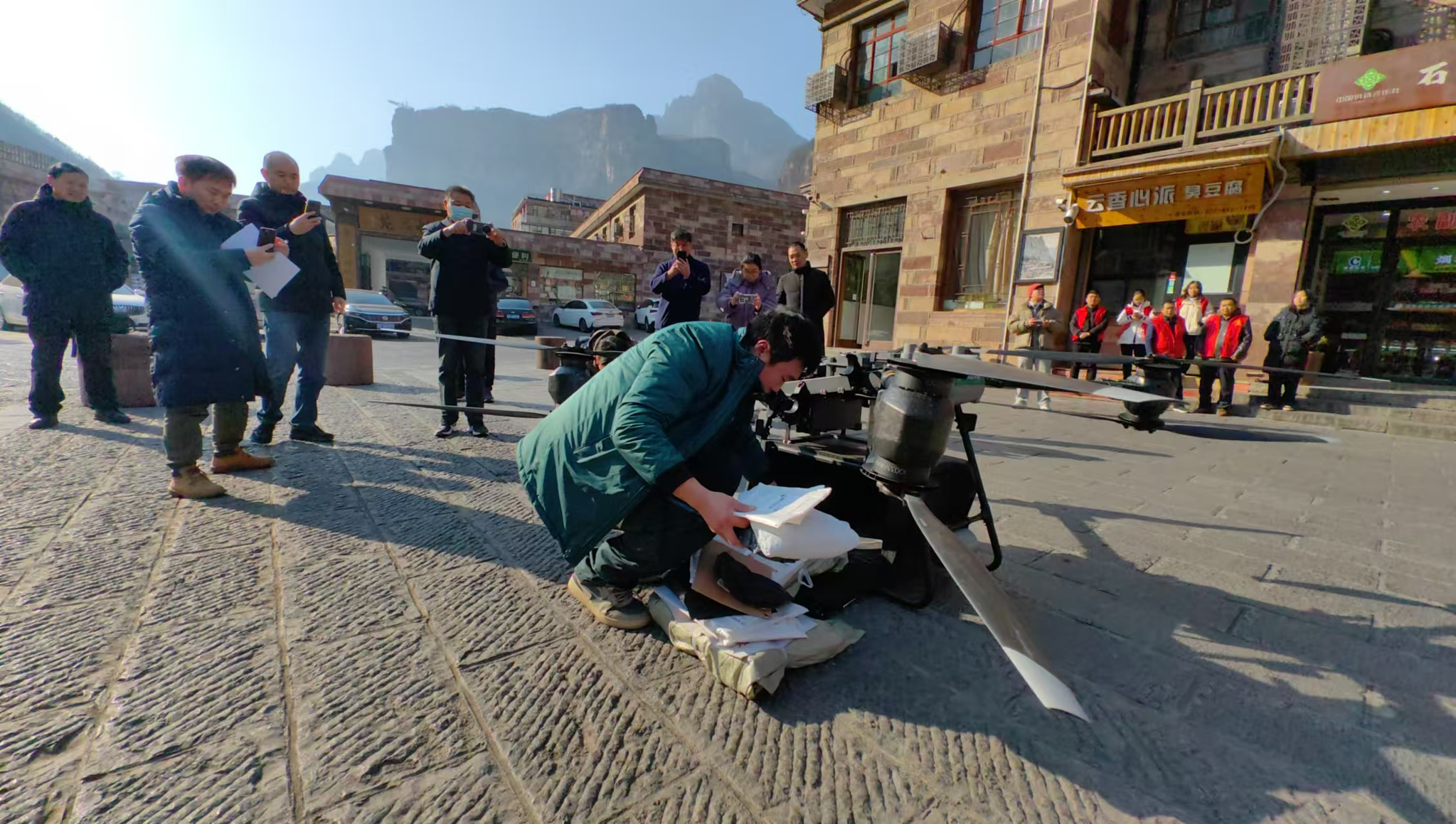測試飛行中,無人機裝載石板岩鎮的黨報黨刊、特快專遞、快遞包裹等30公斤貨物,從林州郵政寄遞物流共配中心升空,在安陽市5G網聯無人機管控平台的調度下,按照預設的航線自動飛行。穿過林州市區、飛越海拔1172米的太行山魯班豁,無人機用時僅約20分鐘,就精準降落在石板岩鎮中心廣場。郵政工作人員打開機艙,接收郵件、立即分發,按址投遞至黨政機關及收件人手中。