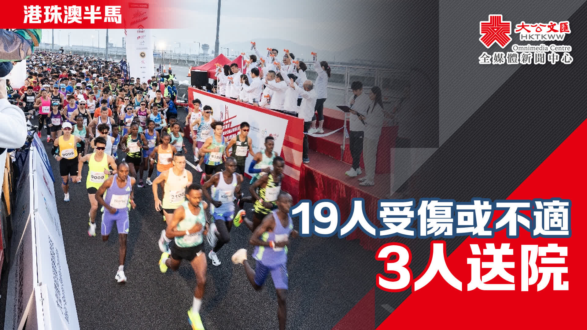 大公文匯全媒體報道,港珠澳大橋香港段半馬拉松今早(5日)舉行,田徑總會表示,截至上午11時,有19名跑手報稱受傷或不適,其中3人需要入院。