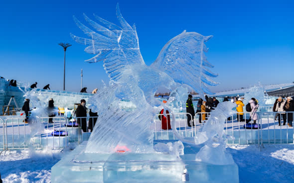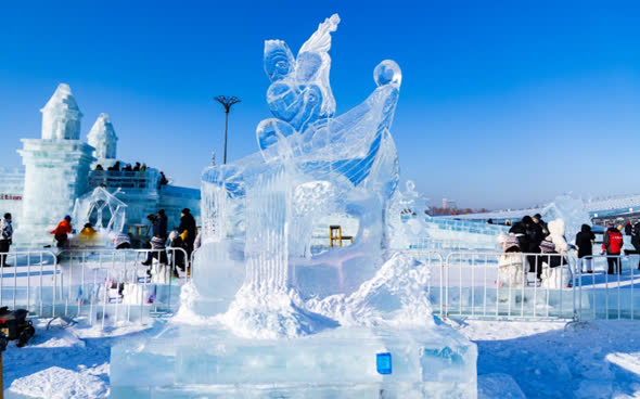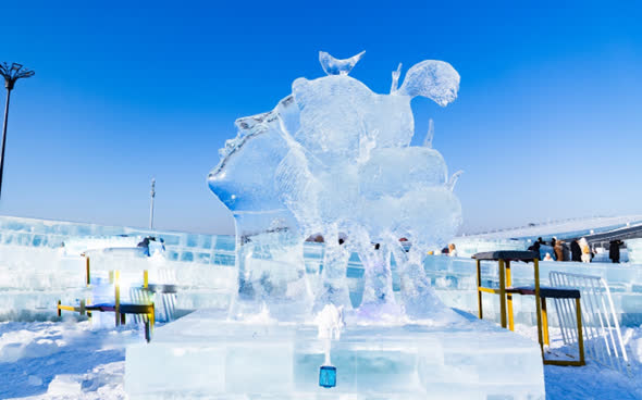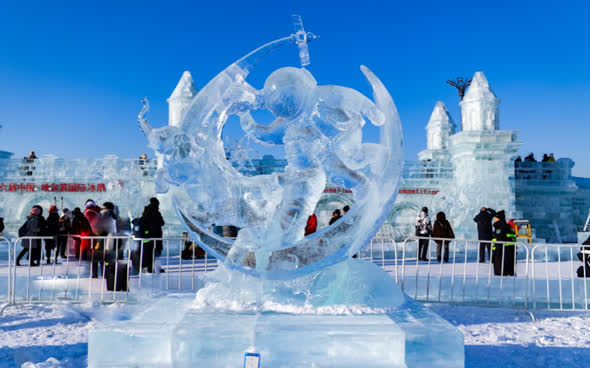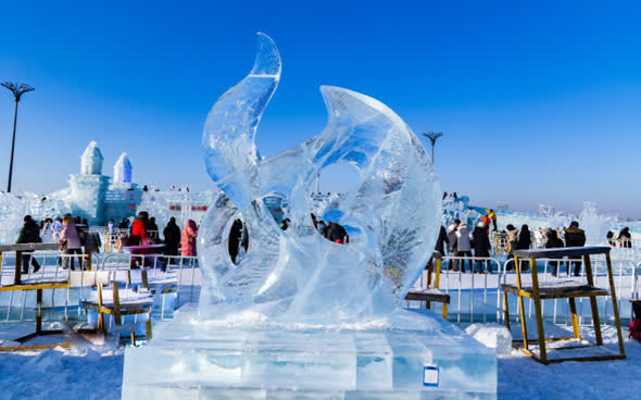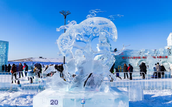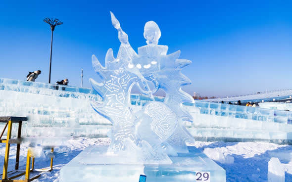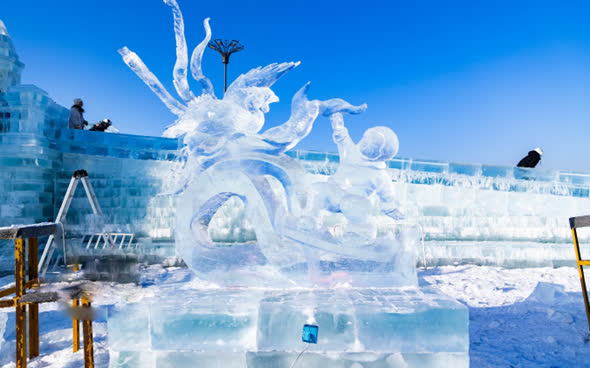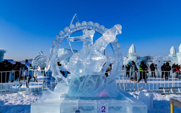 哈爾濱冰雪大世界為參賽隊伍精選高2米、寬2米、厚0.5米的天然冰體。參賽選手們已在冰體上用筆勾勒出輪廓,或用油鋸切割冰體,或揮舞着大冰鏟為作品造型,或手持小冰鏟精心雕琢細節,以極具想像力的藝術手法和巧奪天工的精湛技藝,創造冰雪奇跡。
