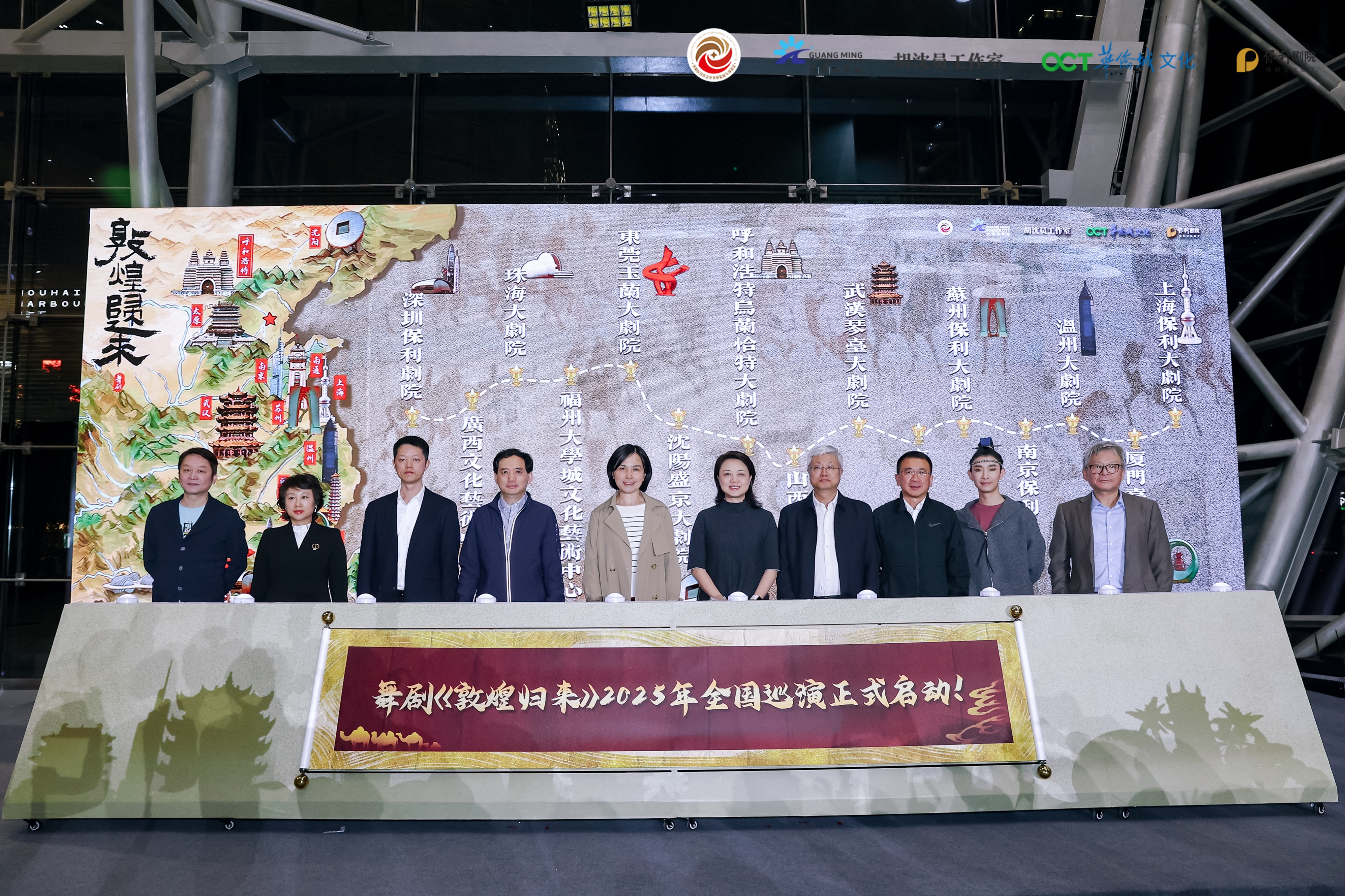 而此次發布會最令人期待的無疑是舞劇《敦煌歸來》的巡演啟動儀式。隨着承載着千年文化與藝術夢想的卷軸緩緩展開,標誌着這部舞劇正式踏上全國巡演的征程。2025年巡演於1月3日-5日在深圳保利劇院震撼首演,隨後將席捲神州大地,包括上海、南京、武漢、瀋陽、福州、南寧、呼和浩特、太原、廈門、珠海、東莞、蘇州、南通、溫州等地。舞劇《敦煌歸來》將以其獨特的藝術魅力,生動展現敦煌壁畫的精妙絕倫與敦煌文化的博大精深,為我國文化事業的繁榮發展注入活力。