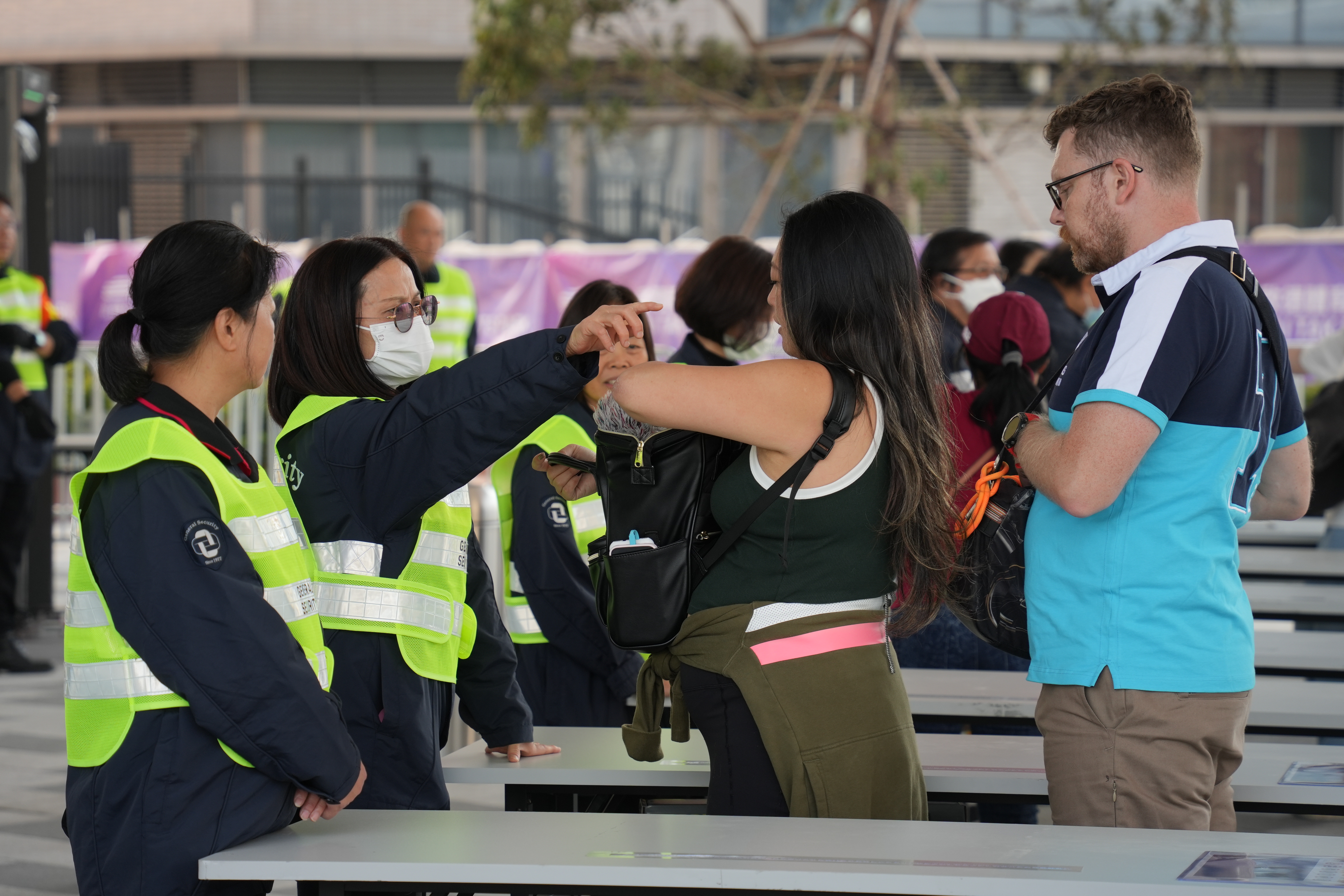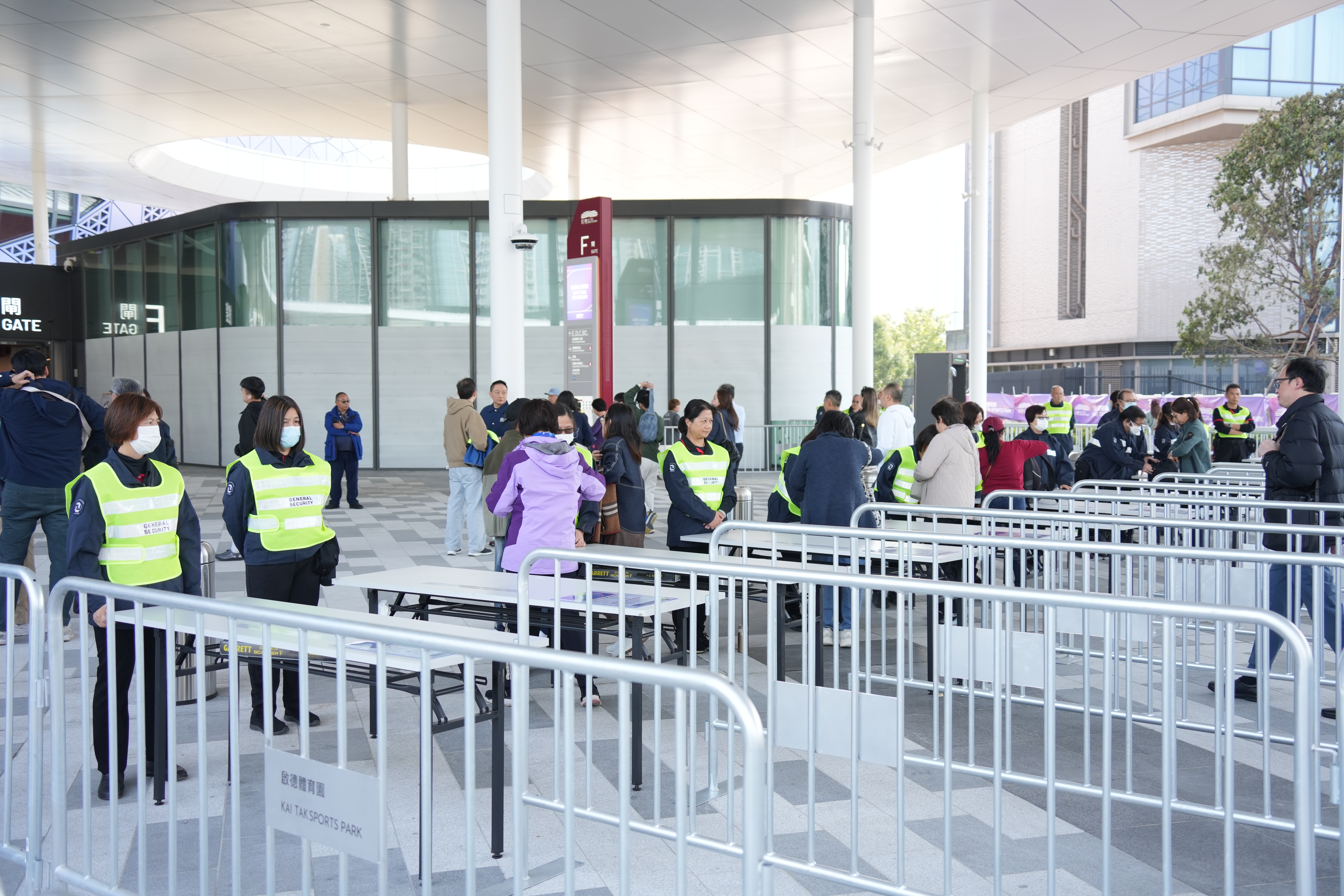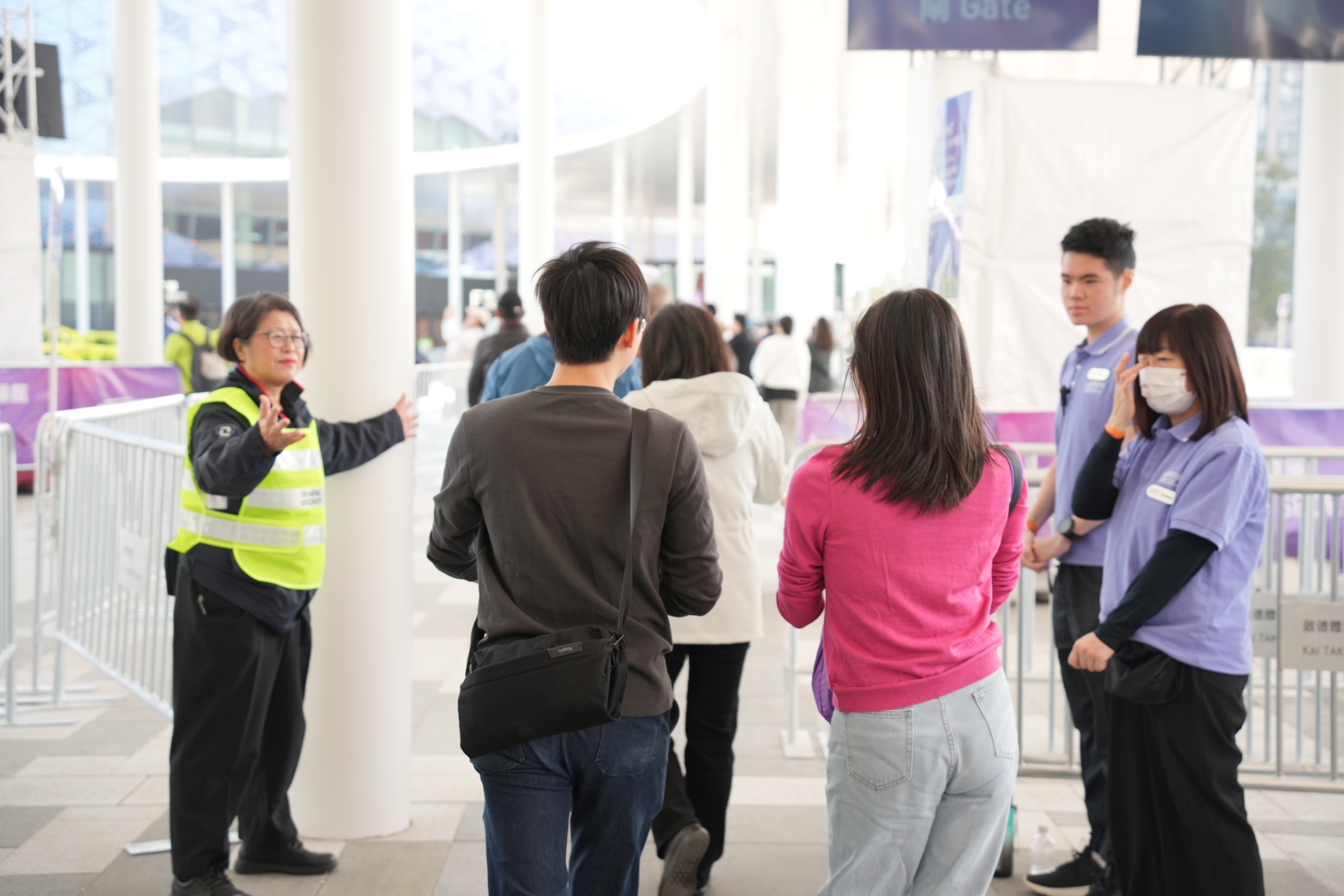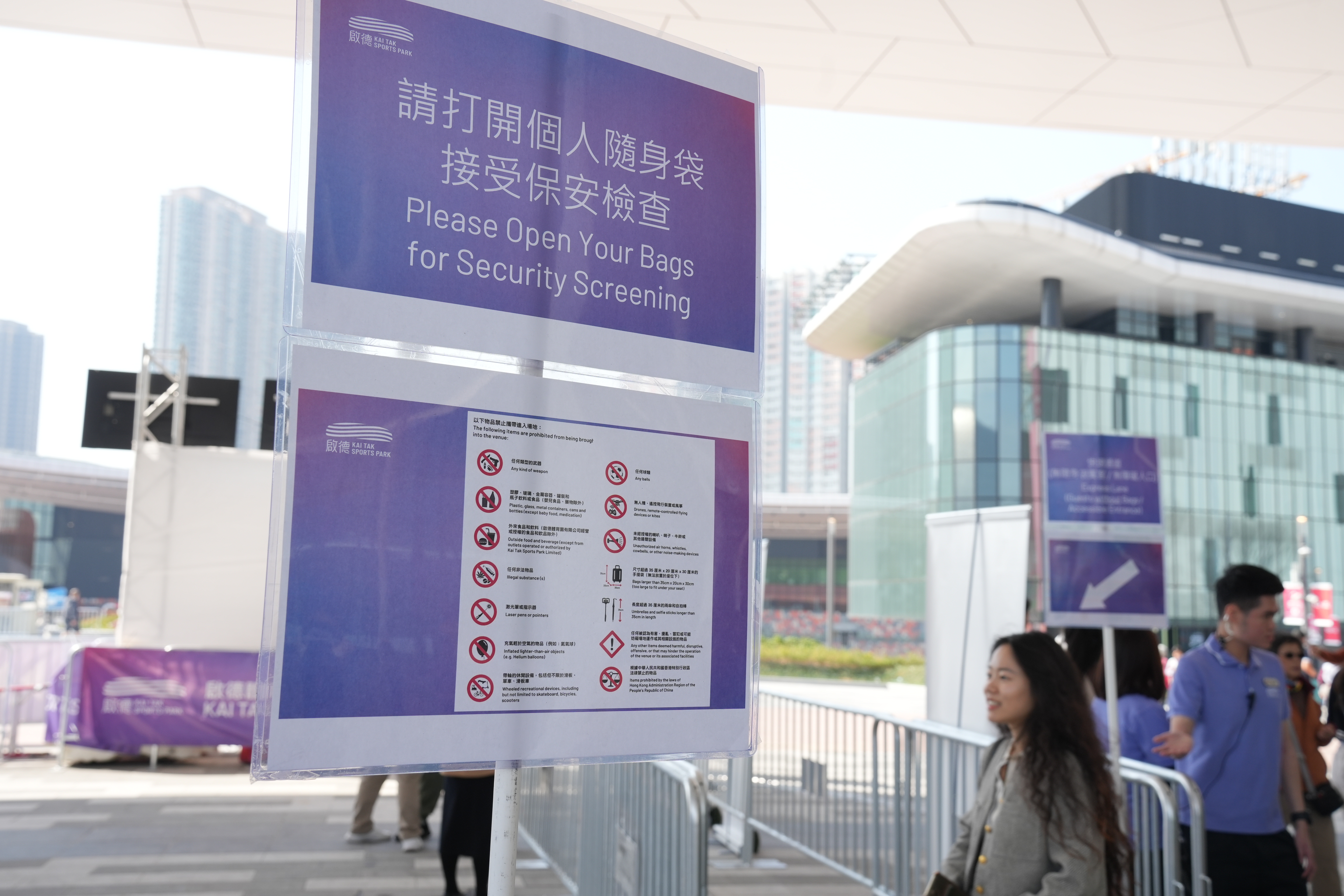 記者下午從港鐵宋皇臺站方向進入,大會透過橫額、顯示屏等方式指示方向,便利市民辨認位置。港鐵站內有乘客廣播和標示,有不少職員維持秩序,協助乘客前往主場館。站外有大批警員和民安隊成員巡邏,亦有醫療輔助隊人員在旁隨時候命。至於主場館現場,安檢情況暢順,有超過14條安檢隊伍,以及1條專用通道,供沒有攜帶手提包或背囊人士入場的另外。大會亦在安檢處附近擺放「雨傘桶」及置物架,讓入場人士放置長傘及水樽。