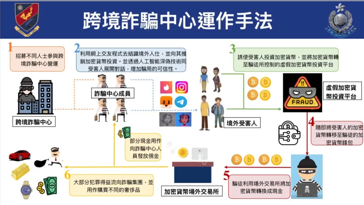 與目標發展網上情緣關係後,騙徒會鼓勵受害人投資虛擬貨幣,並向他們推介網上的虛假虛擬貨幣平台,以高利息回報等誘使受害人向虛擬貨幣投入這些平台的虛擬貨幣錢包裏,而這些虛擬貨幣平台實則由海外詐騙集團營運,最終令受害人血本無歸。