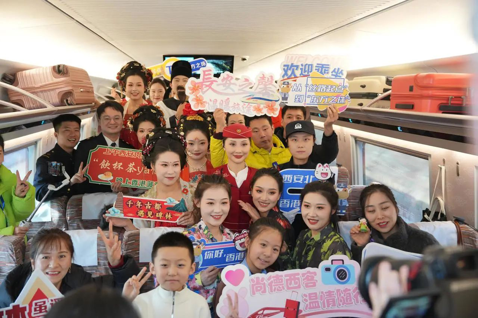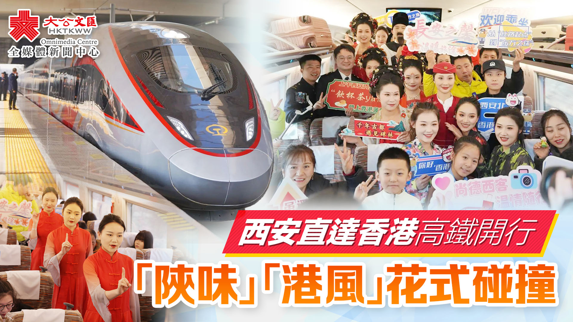 (大公文匯網記者 李陽波 西安報道)「香港,我們來了!」1月5日11時04分,隨着G828次列車從西安北站緩緩駛出,標誌着西安至香港直達高鐵列車正式開行。看着車窗外一襲霓裳羽衣揮手送行的大唐仕女,置身「香港印象」主題車廂的旅客劉女士,彷彿一瞬間便在秦風港韻間先穿行了一個來回。「這邊是香港地標,有銅鑼灣、灣仔、尖沙咀,那便是茶餐廳,還有維港……想想晚上就能去這些地方了,太讓人興奮了。」打量着滿是「港風」元素的車窗貼,劉女士和夥伴們用這句熱情滿滿的口號,表達了即將抵達香港的喜悅之情。