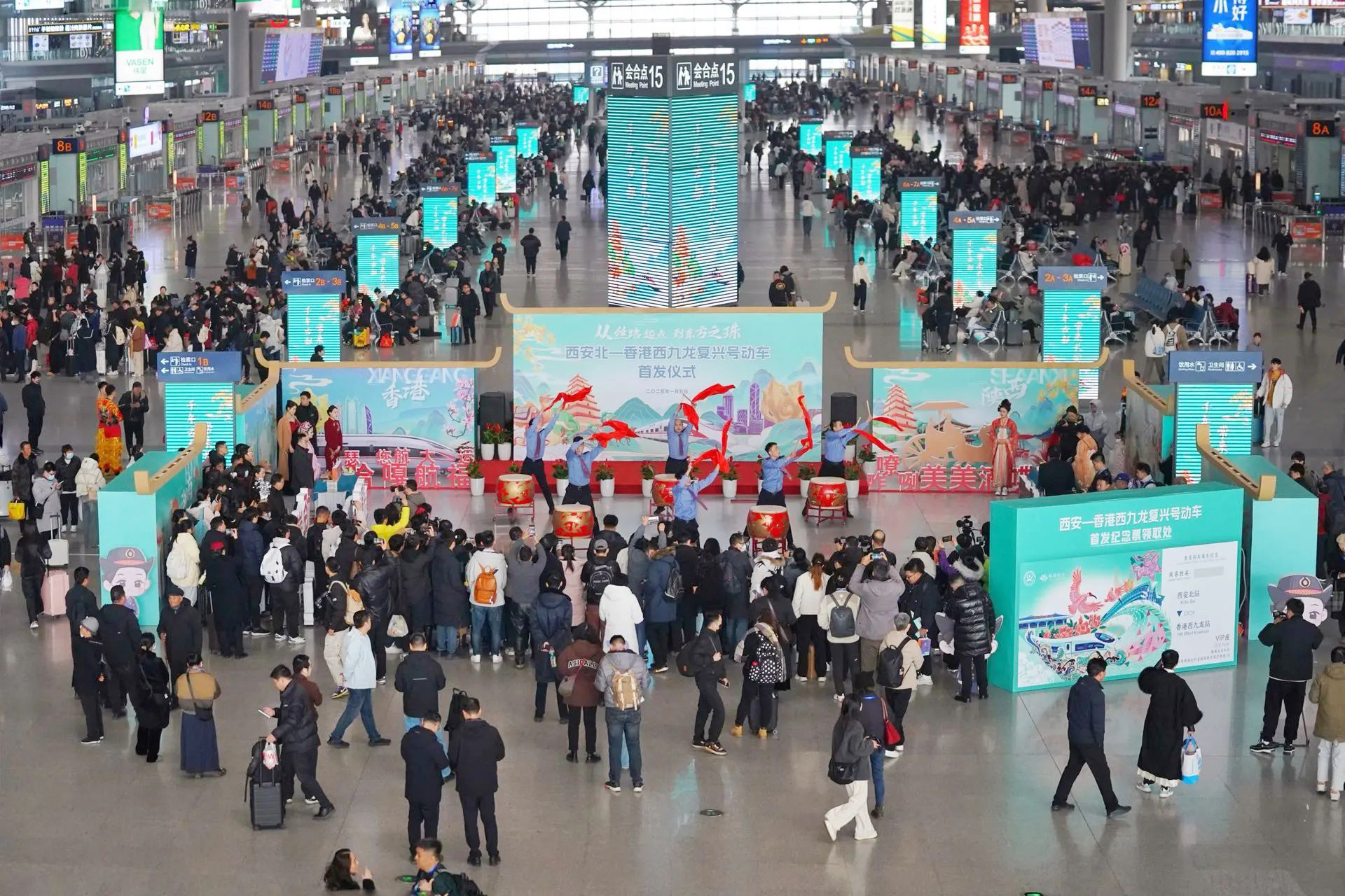為了讓乘坐首趟陝港列車的旅客出行體驗更美好,中國鐵路西安局集團有限公司不僅在首發現場精心打造了陝西歷史文化、香港現代都市風情、途經省市美食文化,以及傳統藝術與非物質文化遺產5個文化展示區,同時所有旅客還可憑首發列車購票信息,獲得打卡印章,深度領略陝港高鐵沿途地域文化魅力。此外,具有兩地特色的安塞腰鼓、舞獅快閃活動也為首趟旅客帶去別樣體驗。