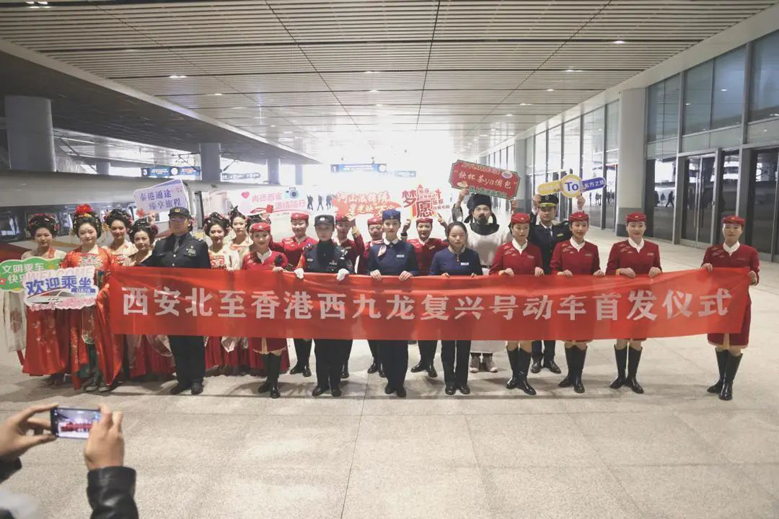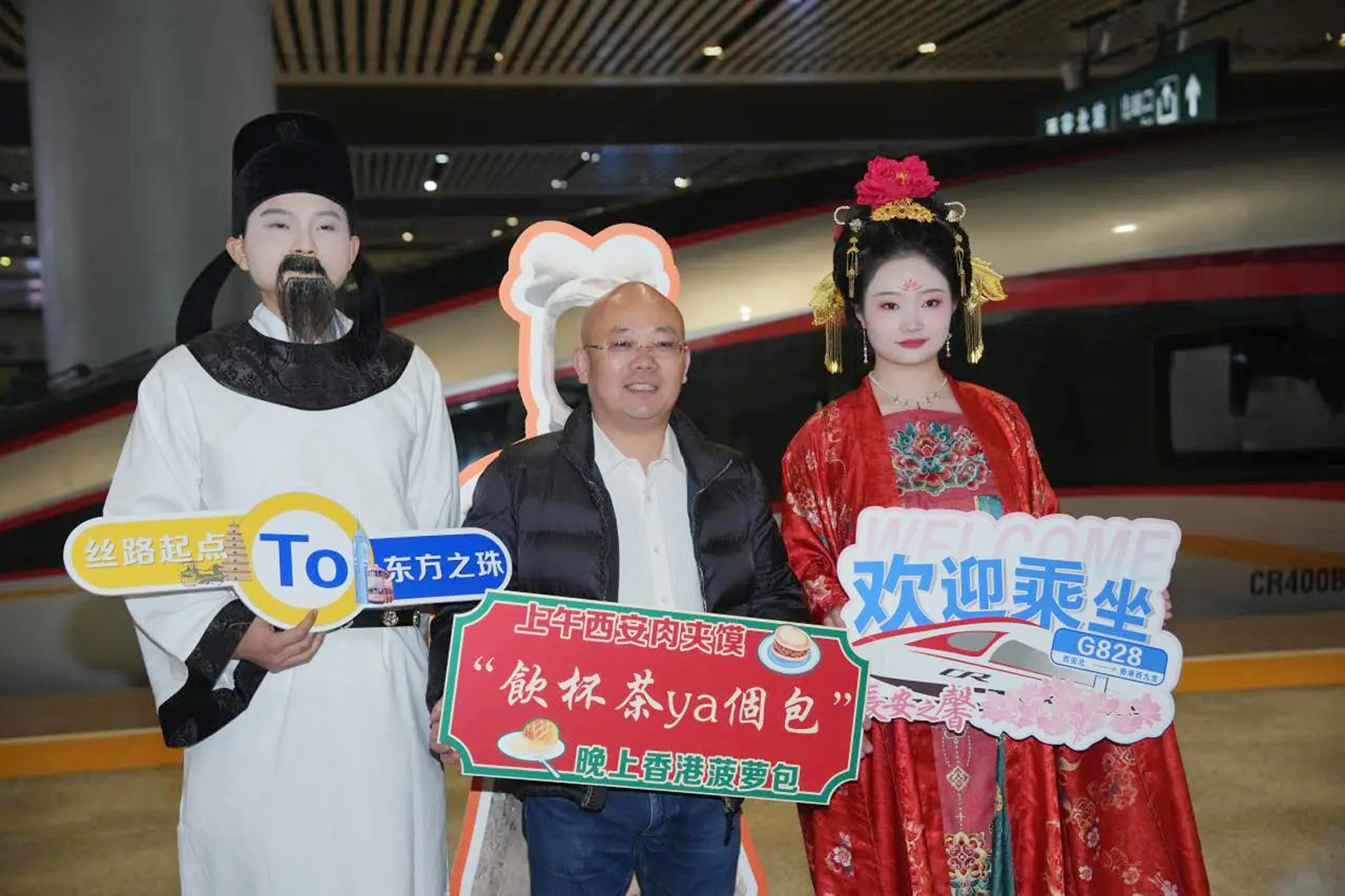 西安站則全方位優化服務舉措,邀請粵語、英語專業老師按照服務流程進行全員全流程授課,並從購票環節起,選派業務精湛、精通粵語與英語的工作人員提供專業諮詢與購票指導,為香港遊客提供一站式個性化購票服務。「送走了去香港旅遊的陝西鄉黨,接下來就是迎接來陝西觀光的香港朋友。」首發現場人氣頗高的「李白」和「楊貴妃」,還有眾多的大唐仕女,不僅是歷史文化傳播者,更是最高禮儀的「迎賓者」。「歡迎香港的朋友們來陝西旅遊,『李白』『楊貴妃』『唐明皇』『房玄齡杜如晦』陪您一起遊長安。」