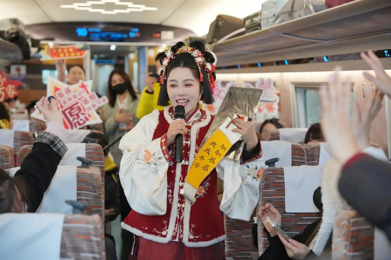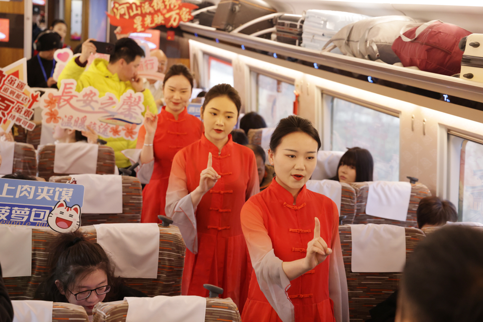 與「香港印象」主題車廂緊鄰的「長安印象」主題車廂,其兩面板壁和車窗被裝飾成了兩幅中國古代畫卷,畫卷的底色為「桑蕾」,內嵌祥雲紋路,寓意「吉祥如意」。嵌入畫卷內的車窗貼,則選取了「長安二十四節氣插畫」圖案,展現古長安城繁華的市井盛況和人文歷史等文化元素。「千歌萬舞不可數,就中最愛霓裳舞。」當日由列車工作人員扮成的唐代侍女在車廂內翩翩起舞,為旅客帶來精彩的仿唐舞蹈《霓裳羽衣舞》。香港金曲串燒、唐詩送福等旅客互動活動讓陝港列車成為歡樂的海洋。