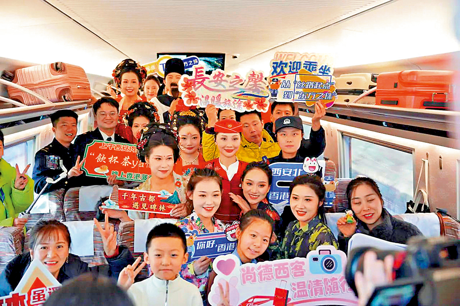 當日,在首發陝港高鐵的候車區,首發列車旅客們在扮演成「李白」和「楊貴妃」的工作人員簇擁下,激動地舉着列車首發創意手舉牌與列車工作人員合影。「送走了去香港旅遊的陝西鄉黨,接下來就是迎接來陝西觀光的香港朋友。」首發現場人氣頗高的「李白」和「楊貴妃」,還有眾多的大唐仕女,不僅是歷史文化傳播者,更是最高禮儀的「迎賓者」。「歡迎香港的朋友們來陝西旅遊,『李白』『楊貴妃』『唐明皇』『房玄齡杜如晦』陪您一起遊長安。」隨着春節的臨近,西安大唐不夜城、大唐芙蓉園、西安城牆、長安十二時辰等歷史主題街區均推出不少沉浸式互動演繹項目。西安旅遊部門期待,隨着直達高鐵的開行,未來能有更多「大唐名人」與香港遊客街頭粵語互動的名場面出現。