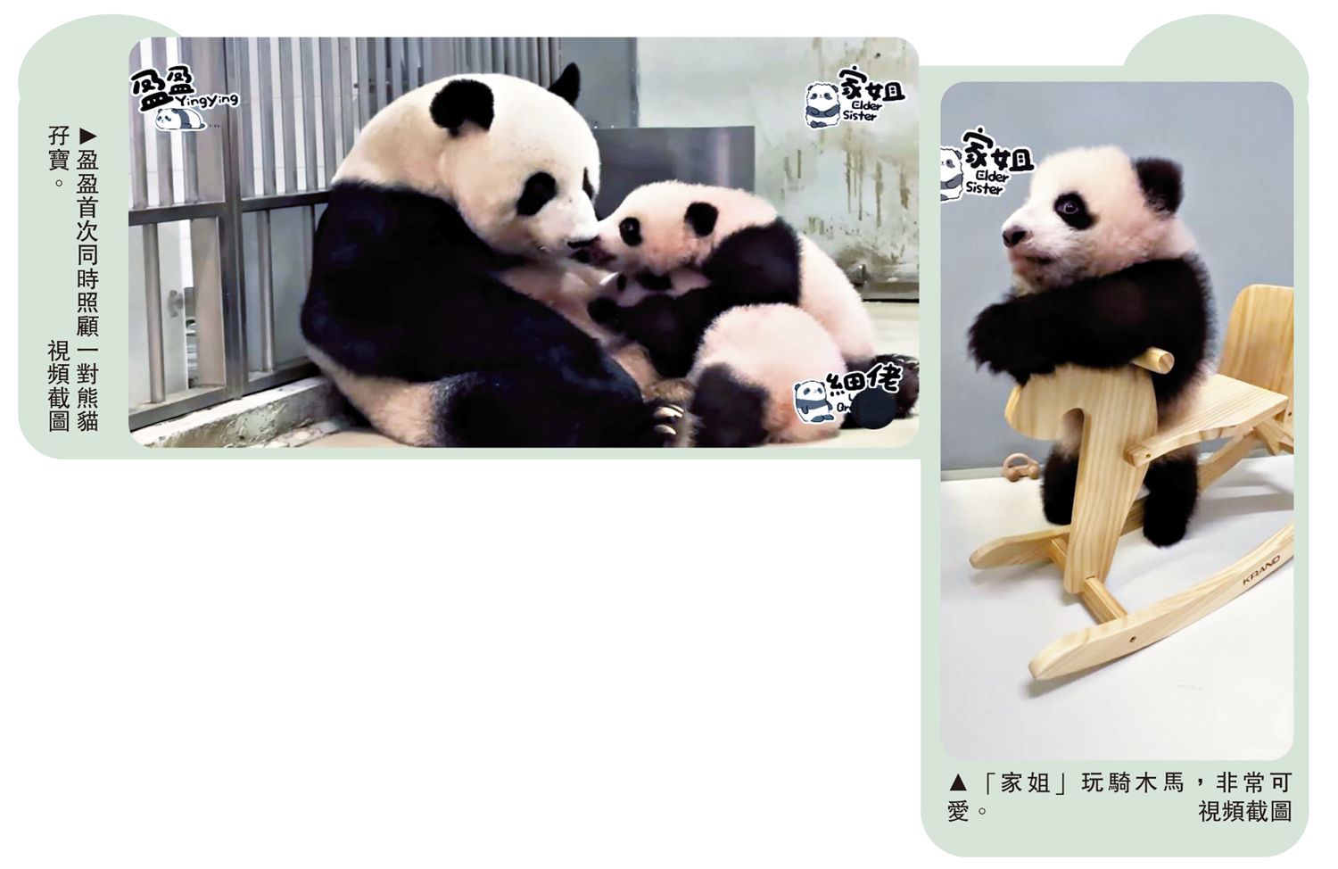大熊貓界的明星「花花」及「福寶」等,在居住園地展出日,往往吸引海量的遊人排隊觀看,捕捉牠們生活日常的視頻,在網上更是排山倒海。在本港,擁有六隻大熊貓的海洋公園,現時在社交平台不時發放六隻大熊貓的片段,當中有關「家姐」、「細佬」生活日常的短片,點讚量一般都破萬。海洋公園內的威威劇場,有實時直播「家姐」、「細佬」情況,不少粉絲拍下直播片段,再在網上分享,吸引不少人關注。