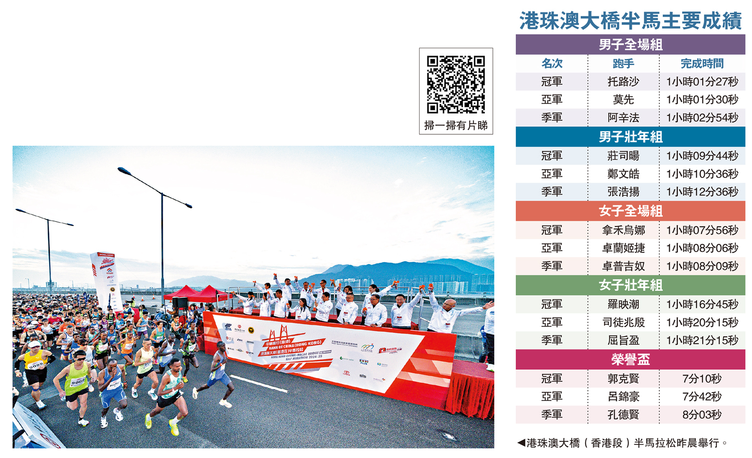(大公報 記者 朱家立)中國銀行(香港)港珠澳大橋(香港段)半馬拉松於昨晨舉行,近7000名跑手一同在全球最長的橋隧組合跨海通道上作賽。本屆賽事獲得不少跑手的正面評價,包括跑手從接駁巴士落點走到起跑點的距離由去年的1000米減至今年的500米、流動廁所增加等。男子壯年組冠軍、本地跑手莊司暘賽後表示,本屆賽事配套要比上屆完善,體驗良好。
