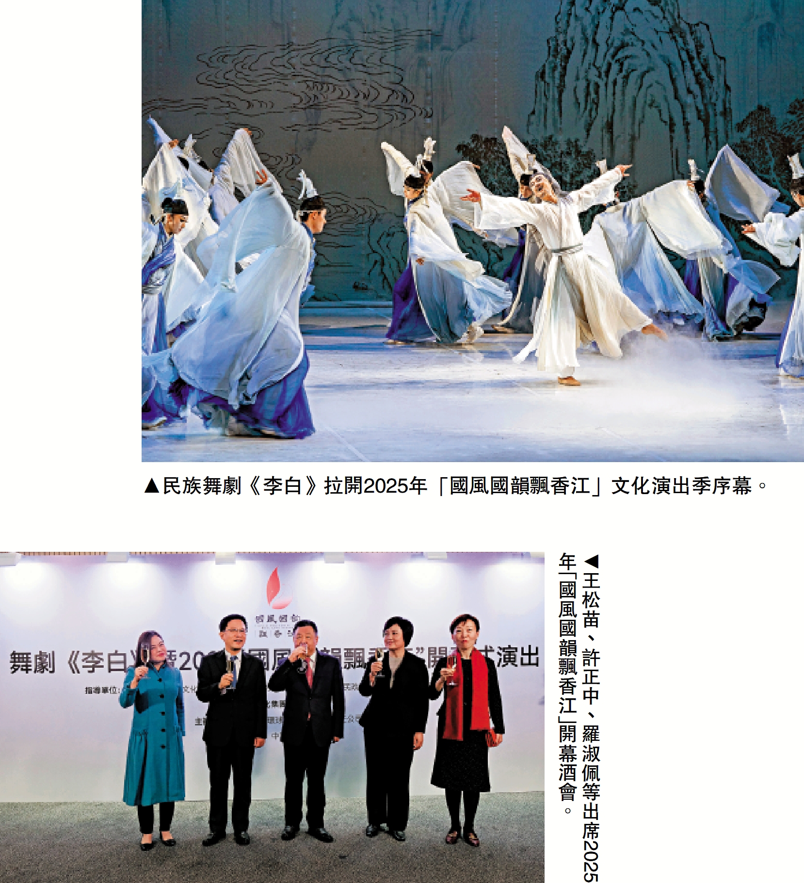 (大公報 記者 徐小惠)劍舞飛揚,詩篇傳頌,將觀眾帶回充滿詩意與豪情的唐代。1月5日,民族舞劇《李白》在香港文化中心亮相,2025年「國風國韻飄香江」文化演出季的開年大戲由此拉開。活動接下來將組織國家大劇院的話劇《林則徐》、江蘇大劇院舞劇《紅樓夢》、中國兒童藝術劇院的兒童劇《貓神在故宮》、西安戰士戰旗雜技團雜技劇《天鵝湖》、上海歌舞團的舞劇《李清照》等8個項目來港演出,為香港市民和遊客送上一場文化大餐。