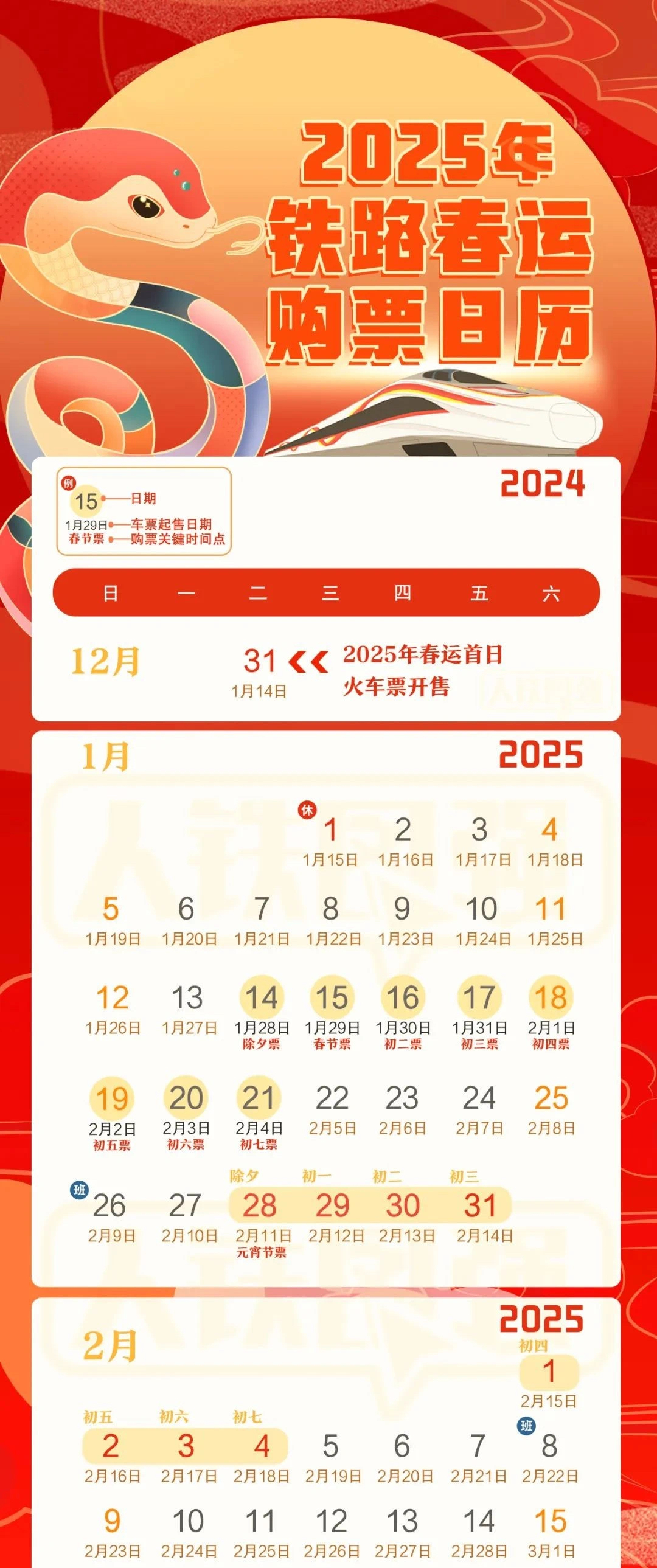 1月28日至29日是農曆新年的除夕、初一,按照目前火車票提前15天開始發售的規則,1月14日可以購買除夕當天(1月28日)的高鐵票,1月15日可以購買大年初一(1月29日)的高鐵票。需要注意的是,香港西九龍站出發車票的起售時間為上午8時。快收好呢份春運搶票日曆,定好鬧鐘,準時鎖定!