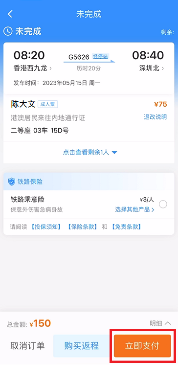 在付款頁面中,旅客須於指定時限內進行網上支付。旅客應再次核對車票資料,並自行選擇是否購買保險。完成以上步驟後點擊「網上支付」。香港及海外旅客可點選以「銀聯在線支付」或「Wechat Pay HK」支付,選擇後請按指示進行網上付款。