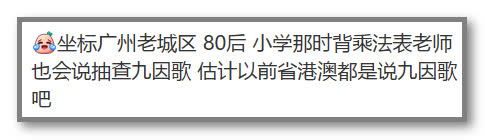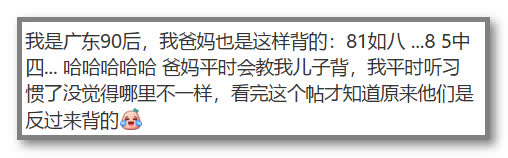 對於兩地的差別,有網友表示:內地老一輩背的也是九因歌。