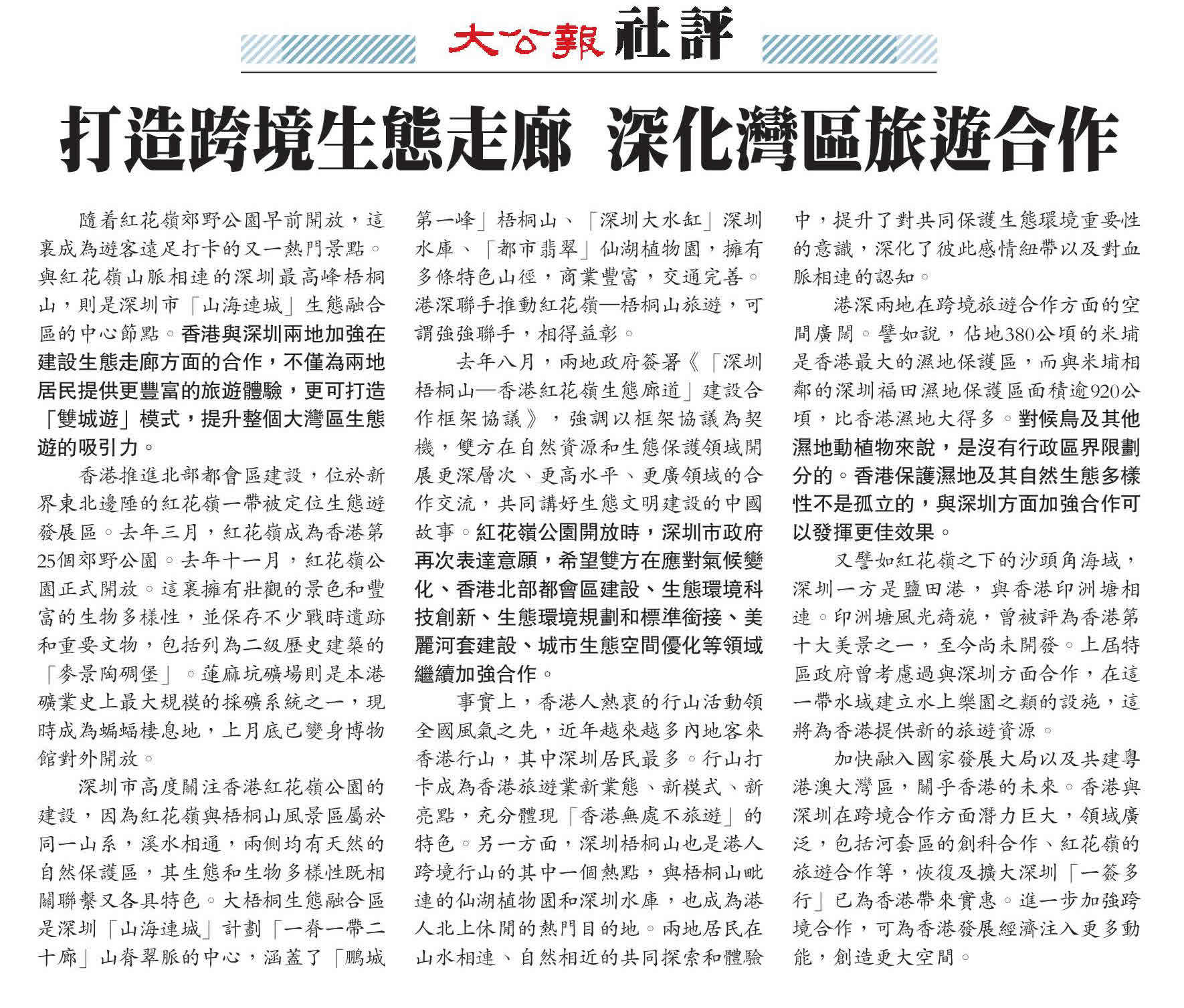 港深兩地在跨境旅遊合作方面的空間廣闊。譬如說,佔地380公頃的米埔是香港最大的濕地保護區,而與米埔相鄰的深圳福田濕地保護區面積逾920公頃,比香港濕地大得多。對候鳥及其他濕地動植物來說,是沒有行政區界限劃分的。香港保護濕地及其自然生態多樣性不是孤立的,與深圳方面加強合作可以發揮更佳效果。