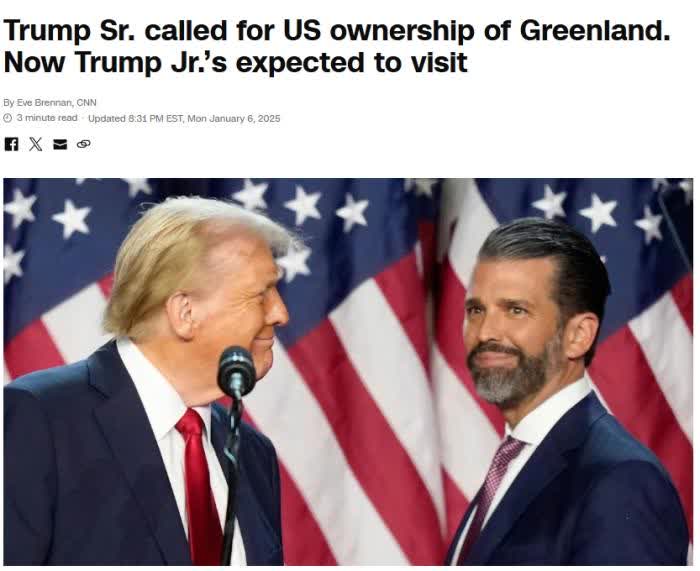 當地時間6日,特朗普在社交媒體上表示,小特朗普將與「各種代表」一起前往格陵蘭島,「參觀一些最壯麗的地區和景點」,並再次表達了對「接管」這片廣闊北極土地的興趣。