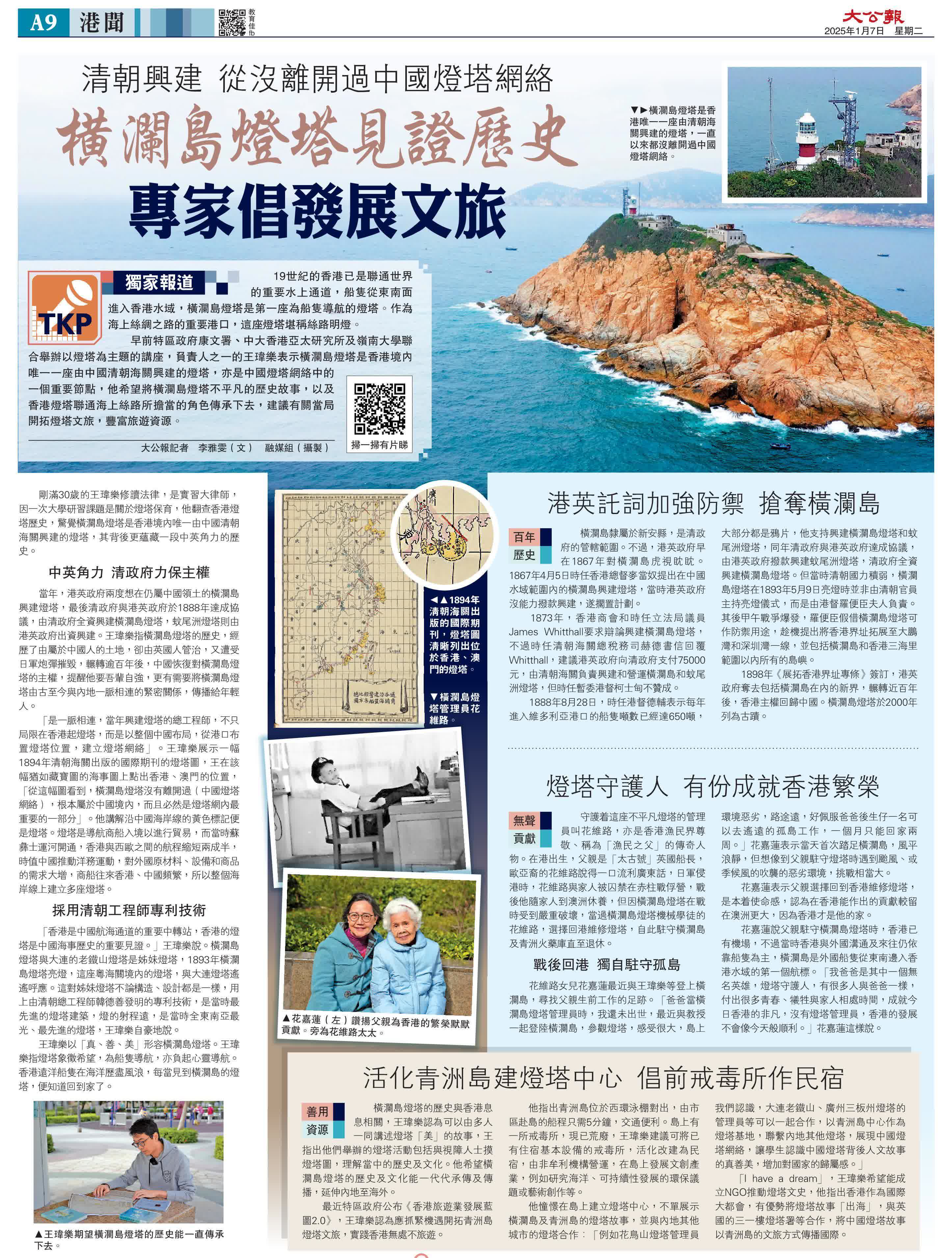「香港是中國航海通道的重要中轉站,香港的燈塔是中國海事歷史的重要見證。」王瑋樂說。橫瀾島燈塔與大連的老鐵山燈塔是姊妹燈塔,1893年橫瀾島燈塔亮燈,這座粵海關境內的燈塔,與大連燈塔遙遙呼應。這對姊妹燈塔不論構造、設計都是一樣,用上由清朝總工程師韓德善發明的專利技術,是當時最先進的燈塔建築,燈的射程遠,是當時全東南亞最光、最先進的燈塔,王瑋樂自豪地說。
