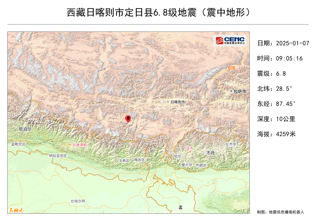 據央視新聞今日(1月7日)消息,據中國地震台網正式測定,今日9時5分在西藏日喀則市定日縣發生6.8級地震,震源深度10公里。記者與定日縣聯繫核實,縣城及周邊震感十分明顯,震中附近有不少房屋倒塌。記者從西藏自治區地震局獲悉,已有人員遇難,涉及定日縣長所鄉、曲洛鄉、措果鄉等三個鄉。