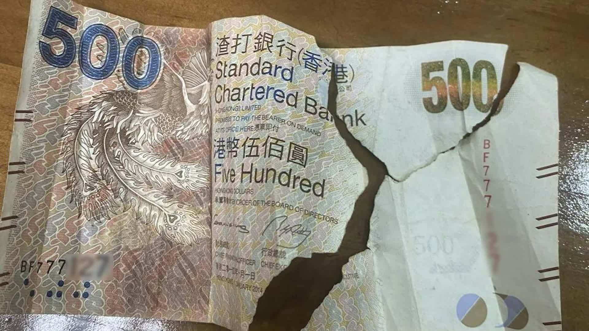 樓主在小紅書發帖,以「萬能的小紅書想問下撕破的港幣可以用嗎?」為題詢問網民,稱自己最近在整理袋子時,找出一張2015年到香港旅遊時剩下的港幣「但是被我撕破了,想問還可以用嗎?」她指之後會再來香港旅遊,不知道可否兌換成新的。照片所見,該渣打銀行發行的500元鈔票中間位置被撕開一半,右邊再撕一下,變成分成3片的「碎鈔」,但整體沒有缺失。