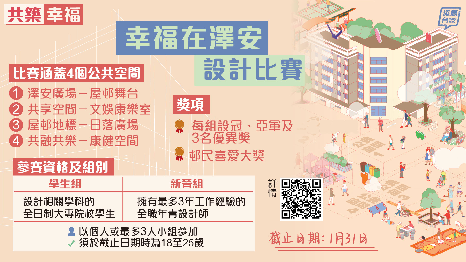 「幸福在澤安」設計比賽誠邀本港青年設計師和學生參加,為深水埗澤安邨建設一個共融的幸福公共空間,得獎作品有機會作為日後屋邨改善計劃的參考。