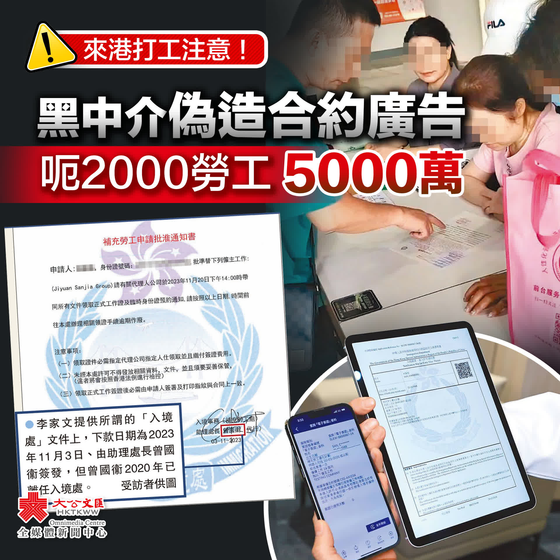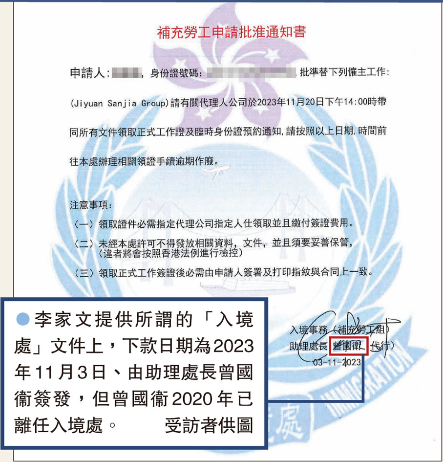 李家文又聲稱曾成功協助多名外勞赴港工作,為增強說服力,更提供了一份聲稱是入境處簽發的入境文件,記者卻發現有不少破綻,首先文件不單色彩、字體不統一,更出現錯別字及繁簡體中文混用的情況,甚至連入境處處長中英文名都寫錯。