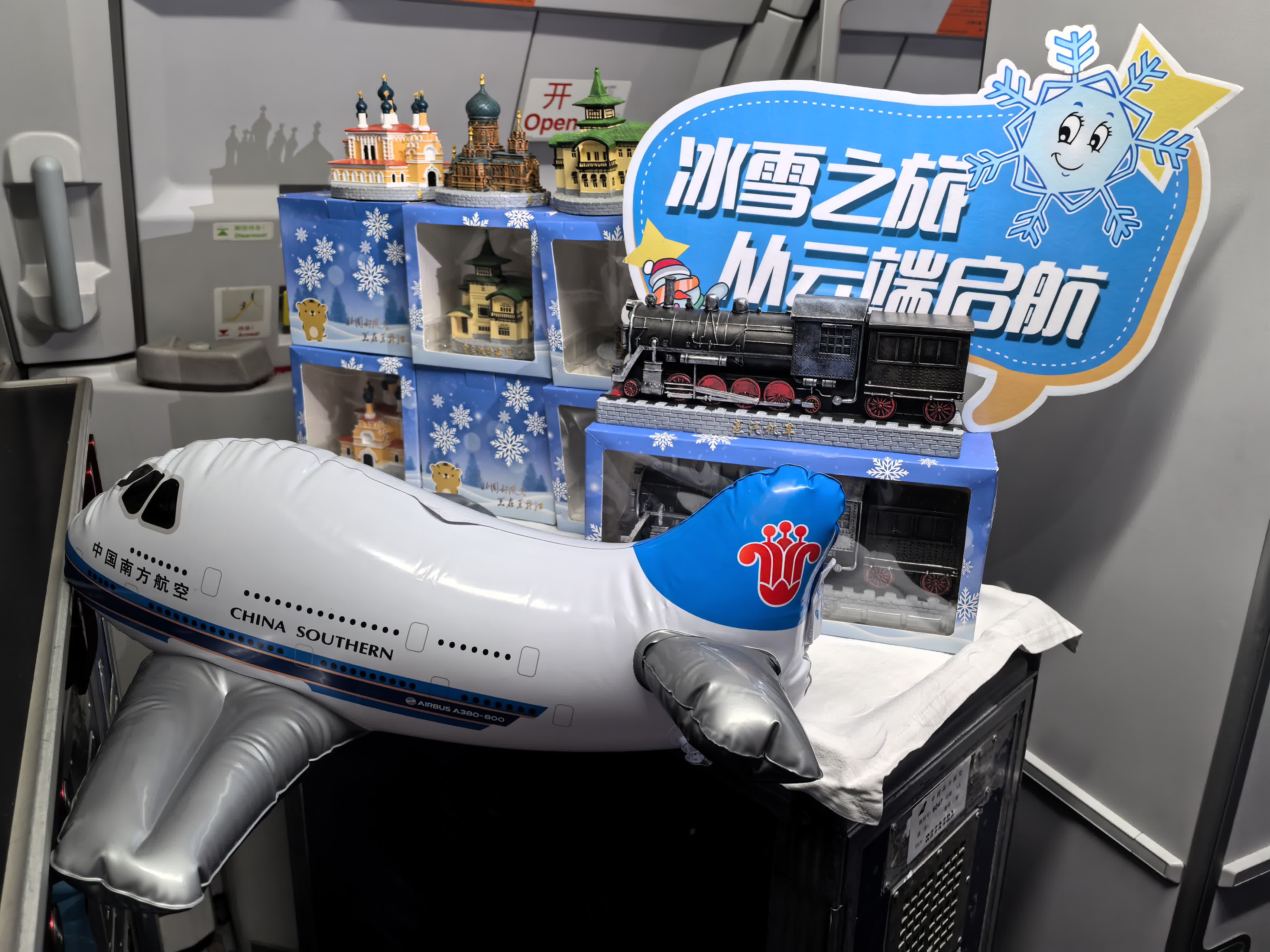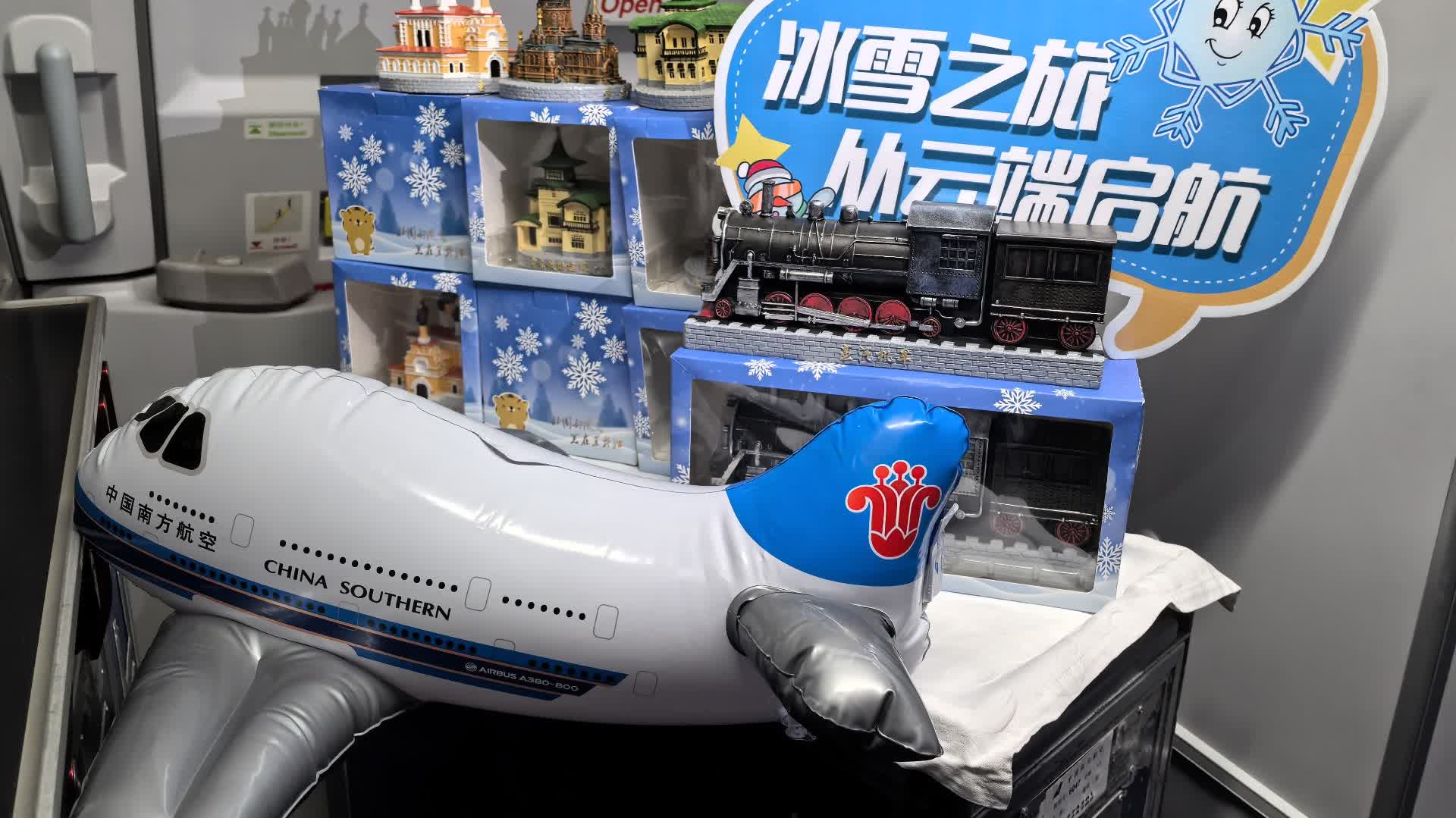 這個大火車為啥代表特色景點呢?有香港旅客好奇地問着,「這個大火車是中東鐵路建築模型,它背後有着這樣的故事……」乘務員微笑地做着介紹。下飛機去哪能嘗到地道的哈爾濱味,去哪住到松花江邊更便利,下飛機到索菲亞教堂該咋走呢?面對每一個問題,乘務員都細心地解釋着。這就是南航乘務組在航班上為旅客開展的「冰雪慶典」主題航班現場活動的精彩瞬間。「真是一次奇遇,遇到你們很開心,我記住了每年的1月5日是中國·哈爾濱國際冰雪節,更難忘的是2025年我是在南航航班上參與慶祝的!」旅客林女士說到。
