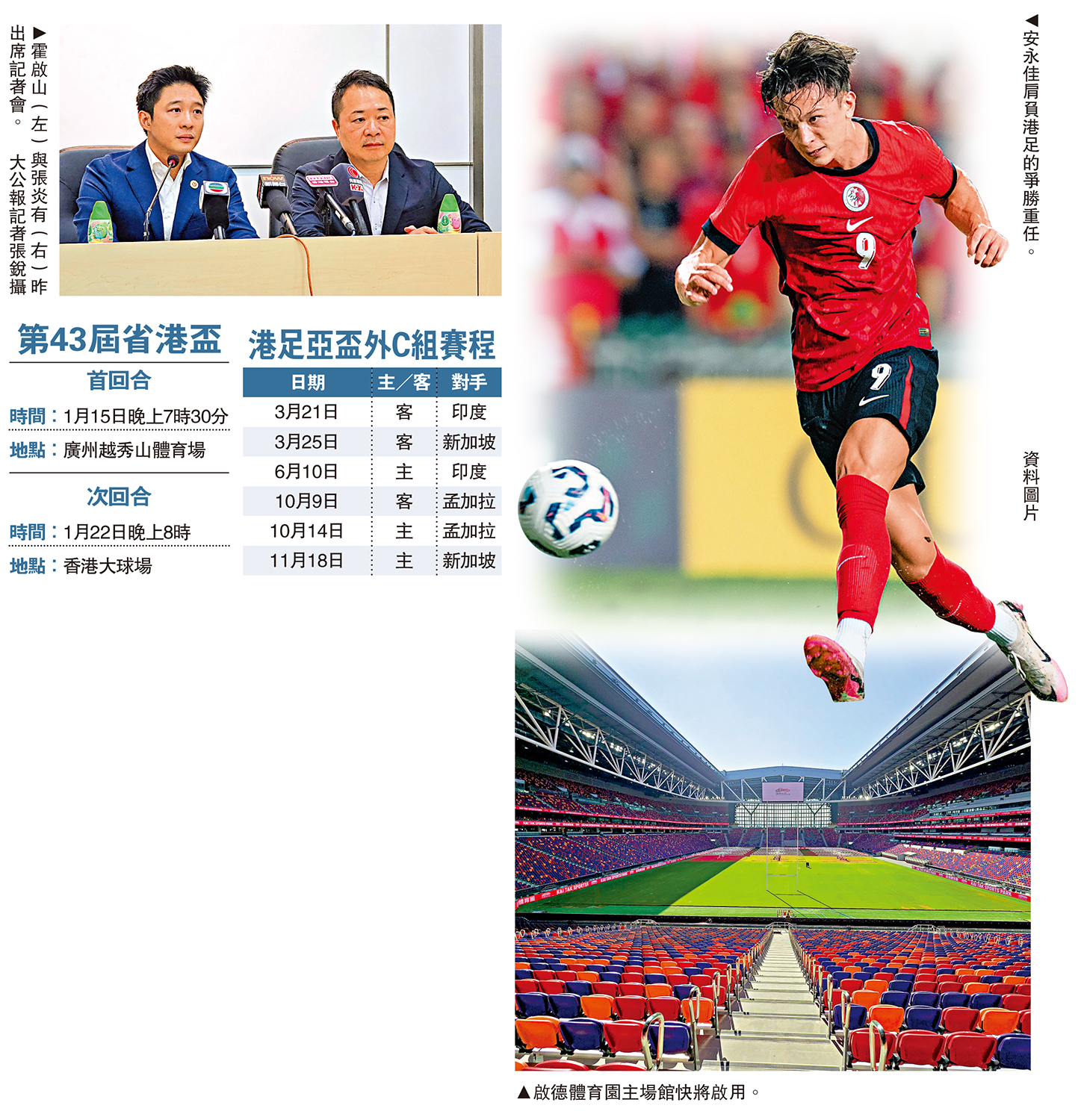 (大公報 記者 張銳)第43屆省港盃足球賽將於本月15日和22日上演合共兩回合賽事。中國香港足球總會昨天公布次回合將在香港大球場舉行,正價門票買一送一。中國香港男子足球代表隊主教練韋斯活將不會帶隊,改由港足U20主教練戴雅諾領軍。足總亦公布,將爭取在今年舉行的3場亞洲盃外圍賽主場賽事於啟德體育園主場館舉行,足總主席霍啟山表示,此舉是希望利用新球場產生更多氣氛和本地足球的文化,同時帶給球迷國際級賽事的觀賽享受。