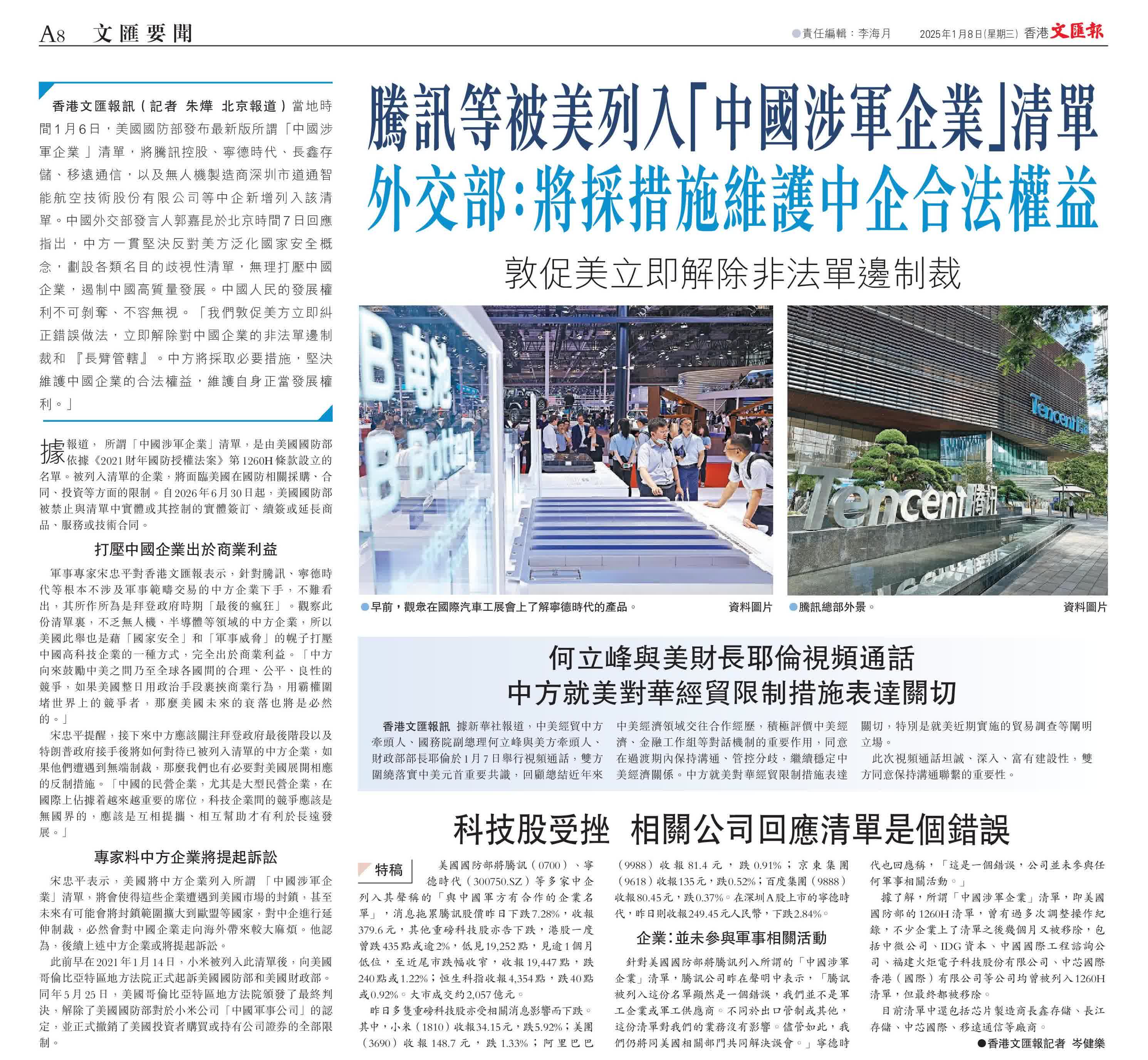 (香港文匯報 記者 朱燁、岑健樂)當地時間1月6日,美國國防部發布最新版所謂「中國涉軍企業」清單,將騰訊控股、寧德時代、長鑫存儲、移遠通信,以及無人機製造商深圳市道通智能航空技術股份有限公司等中企新增列入該清單。中國外交部發言人郭嘉昆於北京時間7日回應指出,中方一貫堅決反對美方泛化國家安全概念,劃設各類名目的歧視性清單,無理打壓中國企業,遏制中國高質量發展。中國人民的發展權利不可剝奪、不容無視。「我們敦促美方立即糾正錯誤做法,立即解除對中國企業的非法單邊制裁和 『長臂管轄』。中方將採取必要措施,堅決維護中國企業的合法權益,維護自身正當發展權利。」