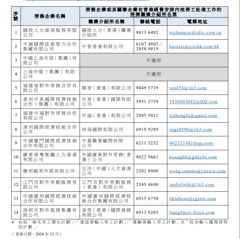 內地勞務企業或其關聯企業在香港經營安排內地勞工赴港工作業務的持牌職業介紹所(如有)聯絡資料詳列於下表: