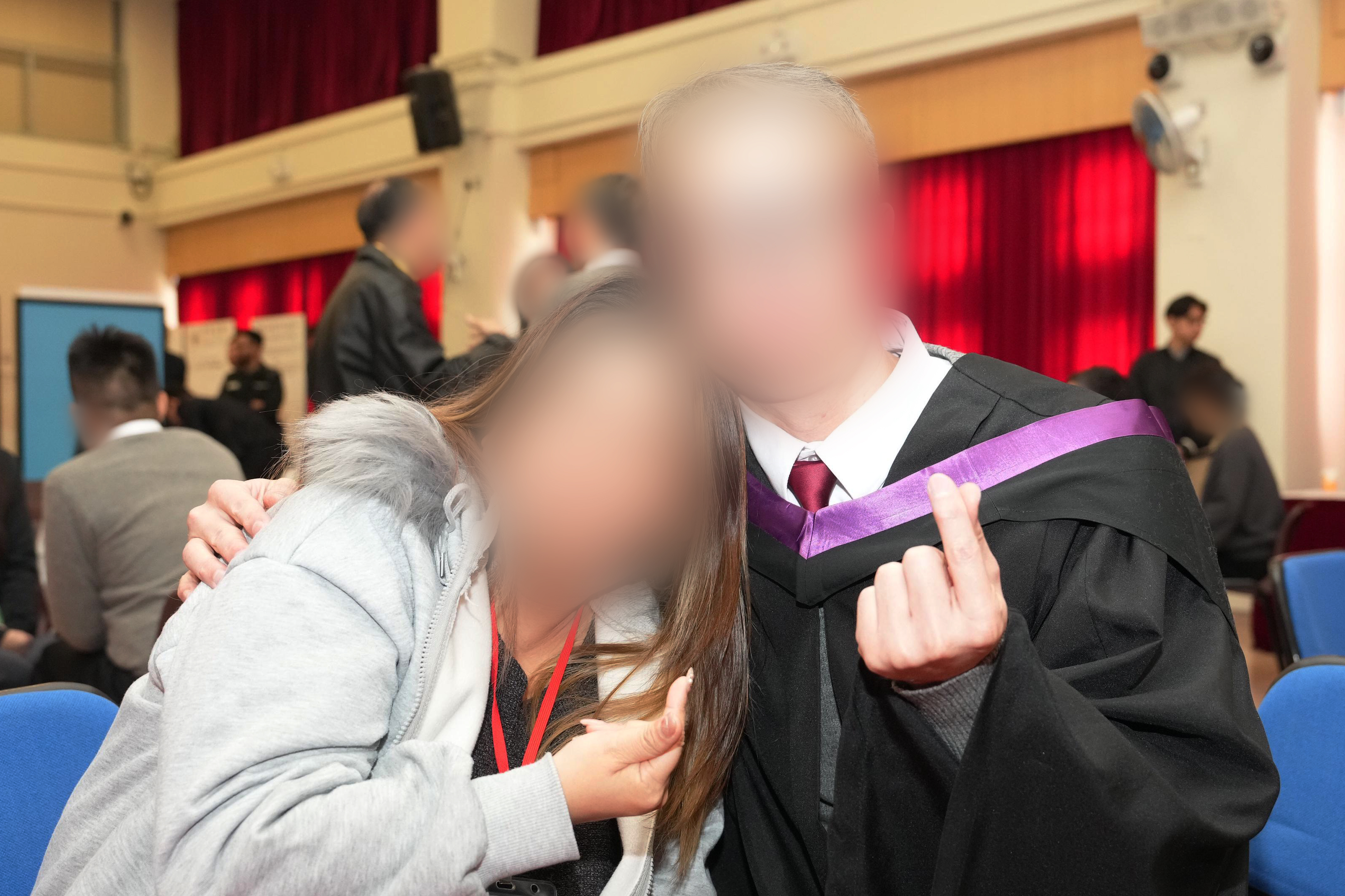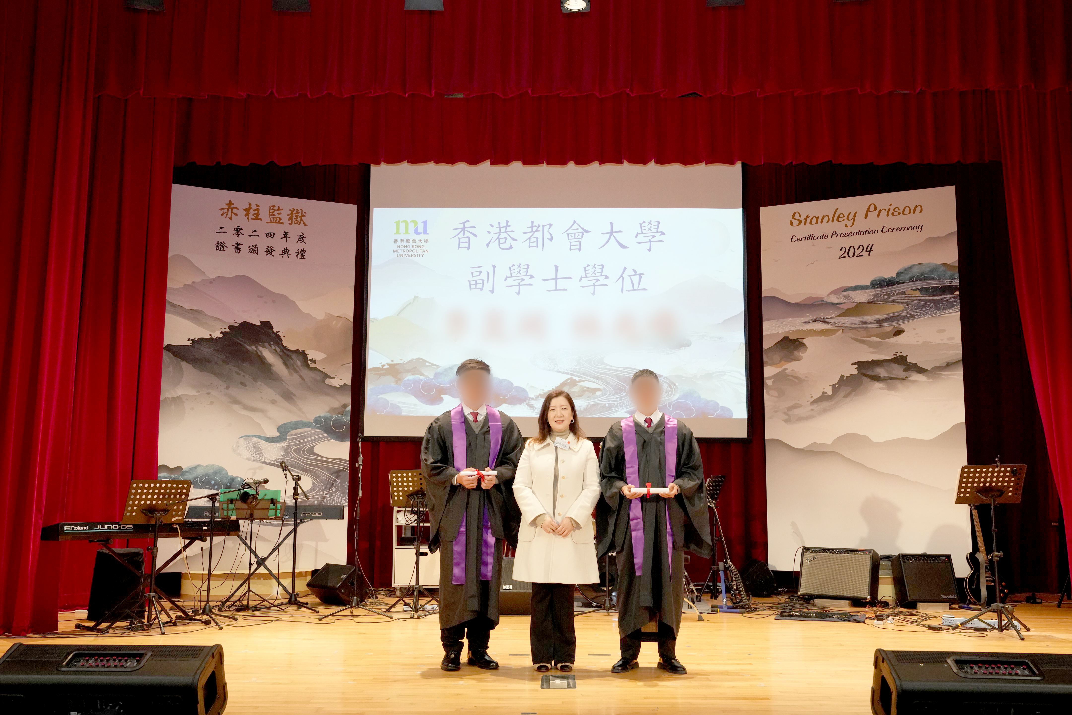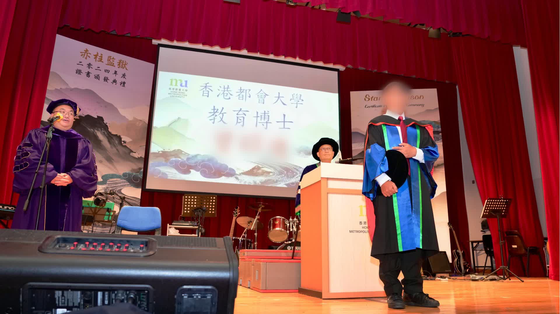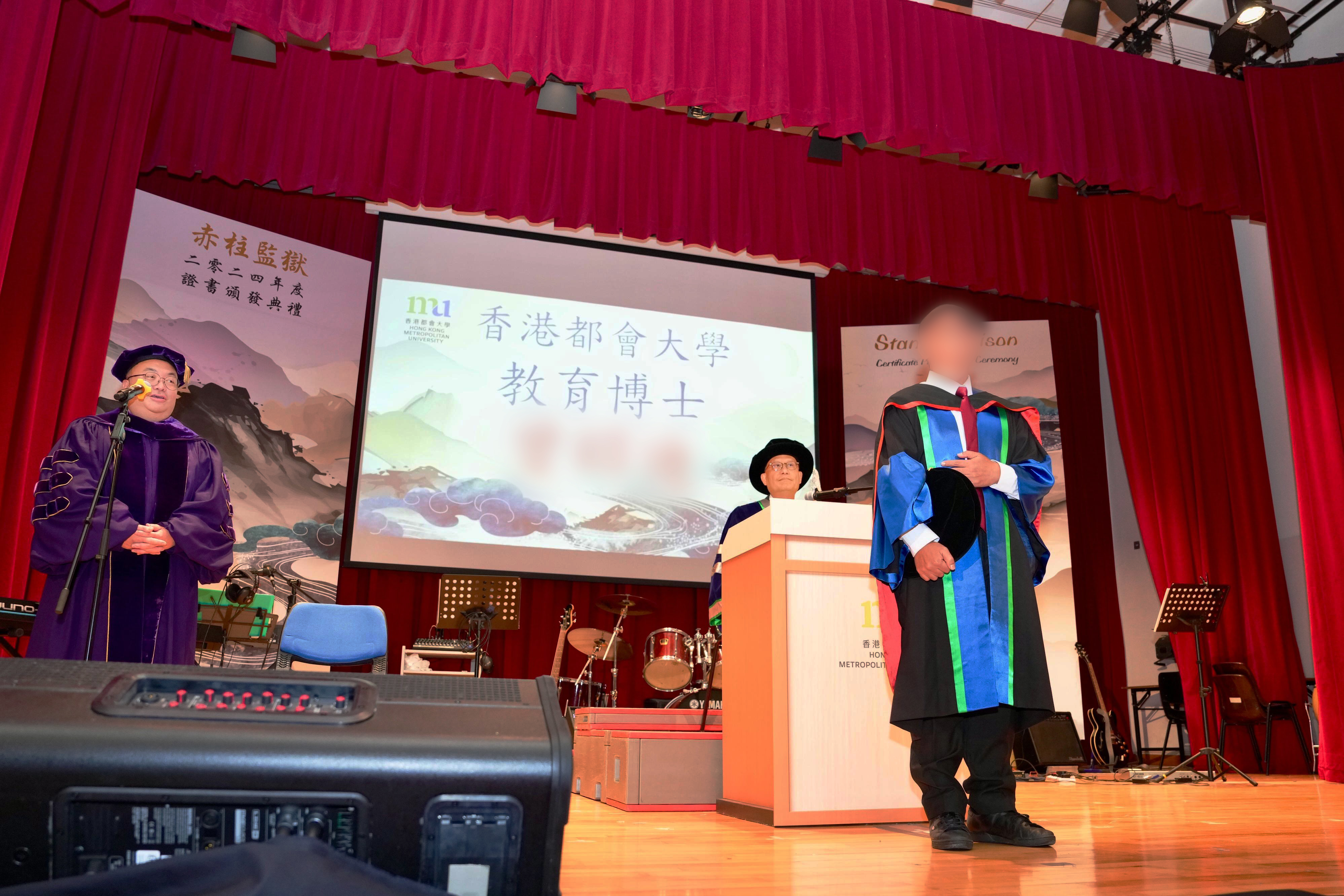 而今日參加典禮的在囚人士中,一人獲都大頒授通識教育學士學位,兩人獲頒通識教育副學士學位,更難得的是有一名在囚人士獲都大頒授教育博士學位,該名在囚人士自2004年開始修讀都大(前身為香港公開大學)的遙距課程,經過20年的努力,成功取得博士學位,成為首位獲本地大學頒授博士學位的在囚人士。都大校長林群聲教授及都大教育及語文學院院長錢志安教授於典禮上頒授博士學位予該名在囚人士。