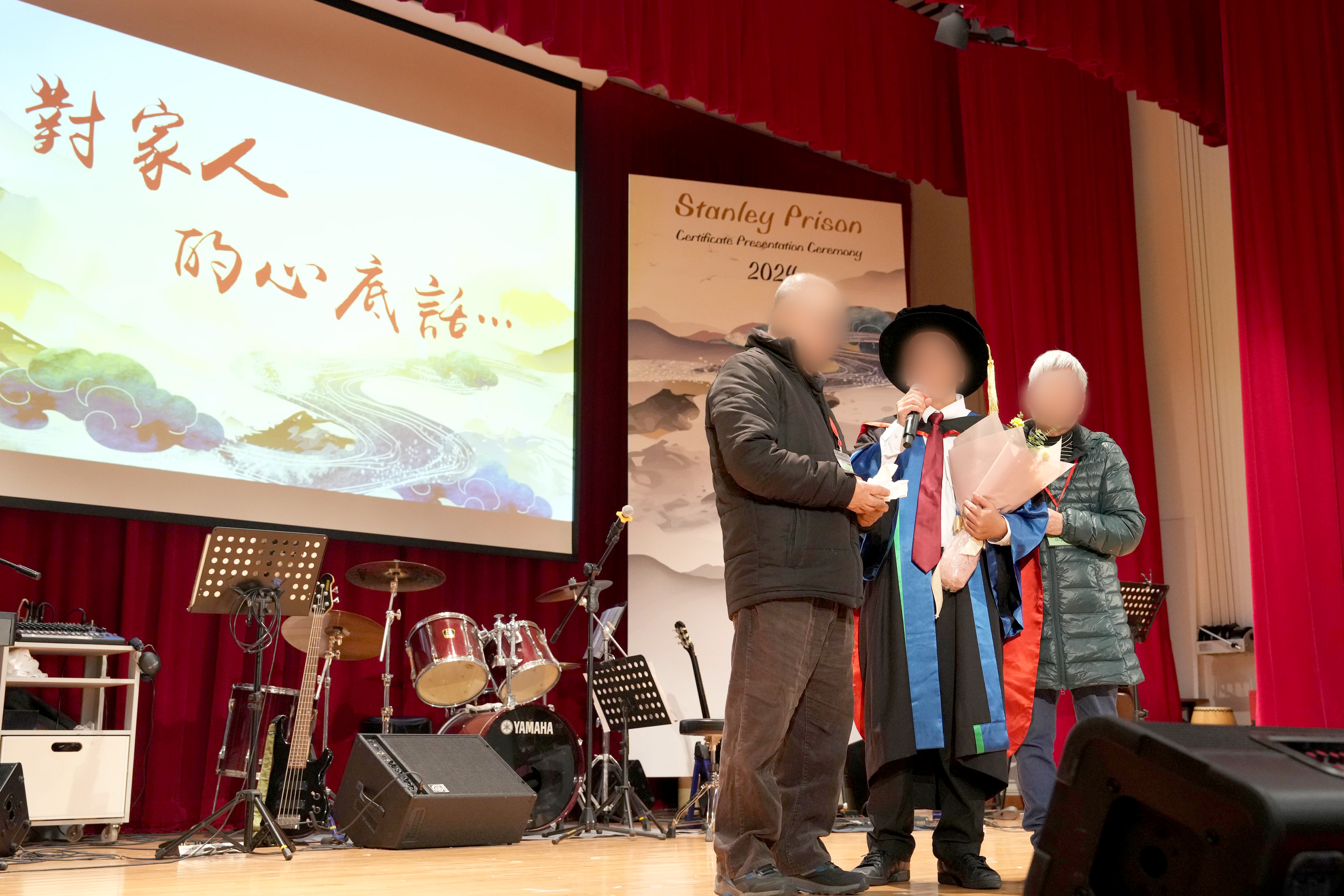 在分享環節中,獲頒博士學位的在囚人士分享更生路上的點滴,並感謝家人的不離不棄及支持。他亦分享自己多年來如何以堅毅的意志和不懈的努力完成博士課程,並感謝懲教人員的全力支持和鼓勵,及學習過程中提供資源和協助,讓他得以順利完成課程。他希望用自身的故事勉勵在囚人士要努力裝備自己,不要輕言放棄。