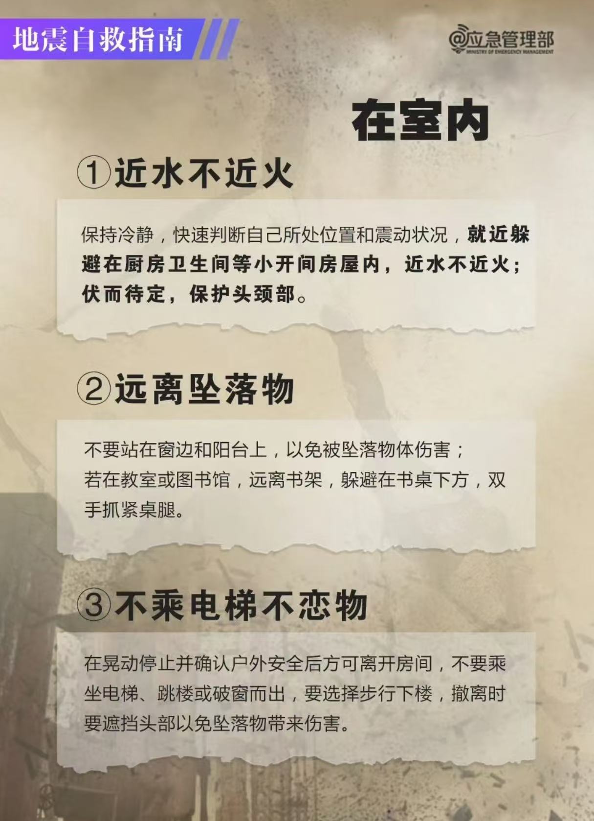 最不可取的行為:千萬不要躲在房樑下,不要躲在窗戶邊。切忌逃出後又返回取財物。