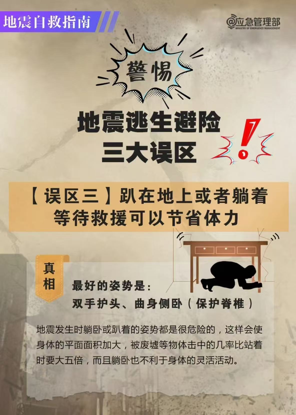 千萬別鑽進床底下:地震後房屋倒塌有時會在室內形成三角空間,這些地方是人們得以倖存的相對安全地點,可稱其為避震空間,包括床沿下、堅固傢私下、內牆牆根、牆角等開間小的地方。以前人們認為鑽到床底下最安全,但床底下能躲不能逃,並非最佳的躲藏之處。