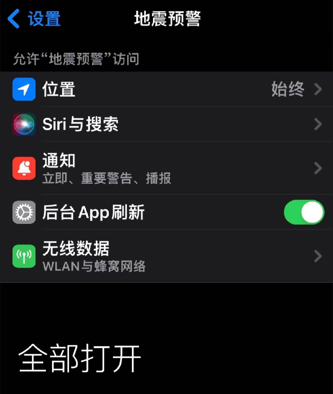 - 點擊「開啟地震預警」並允許「地震預警通知」與「獲取位置」;