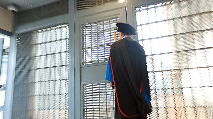 現年51歲的阿俊是昨日典禮的主角之一。中四已輟學的他,年輕時犯下嚴重罪行須長期監禁。在監獄中他除了靜思己過,也希望透過學習尋找答案,為人生負責。自2000年起阿俊在獄中修讀會考課程,2004年開始遙距修讀都大(前身為香港公開大學)課程,先後完成社會科學學士學位及教育碩士學位。其後,他再花8年時間完成博士學位,昨日獲都大校長林群聲及教育及語文學院院長錢志安頒發博士學位,完成學業夢想。