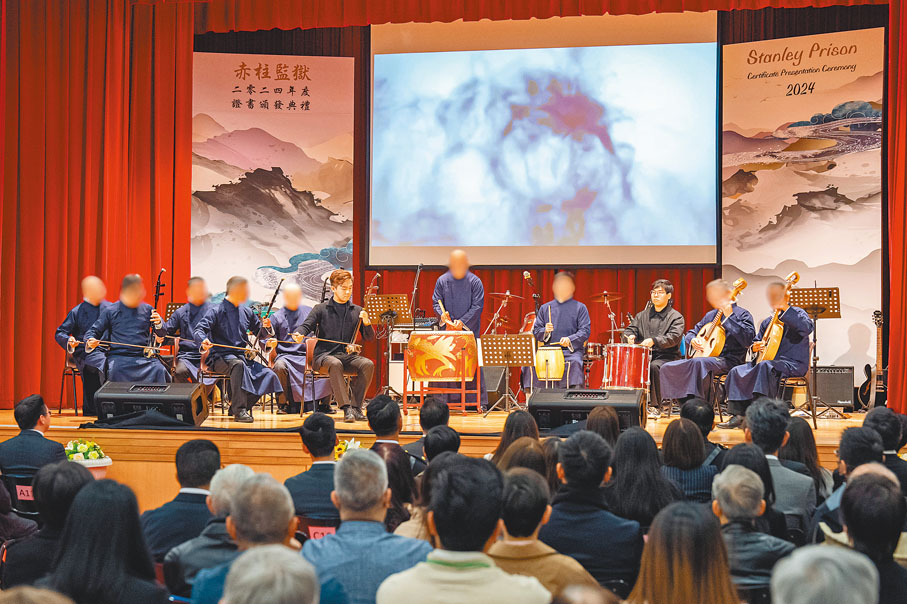 在昨日典禮上,阿俊以一曲《擁抱愛》向父母表達愛意,其後又以結他手身份,與其他在囚者組成樂隊獻唱。另有在囚者與中樂導師合奏表演,並在導師帶領下表演無伴奏合唱。