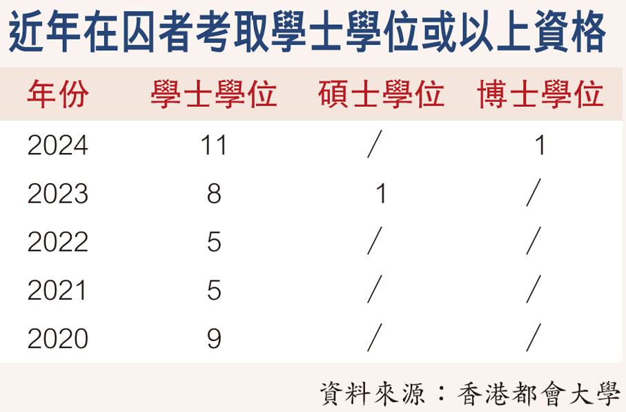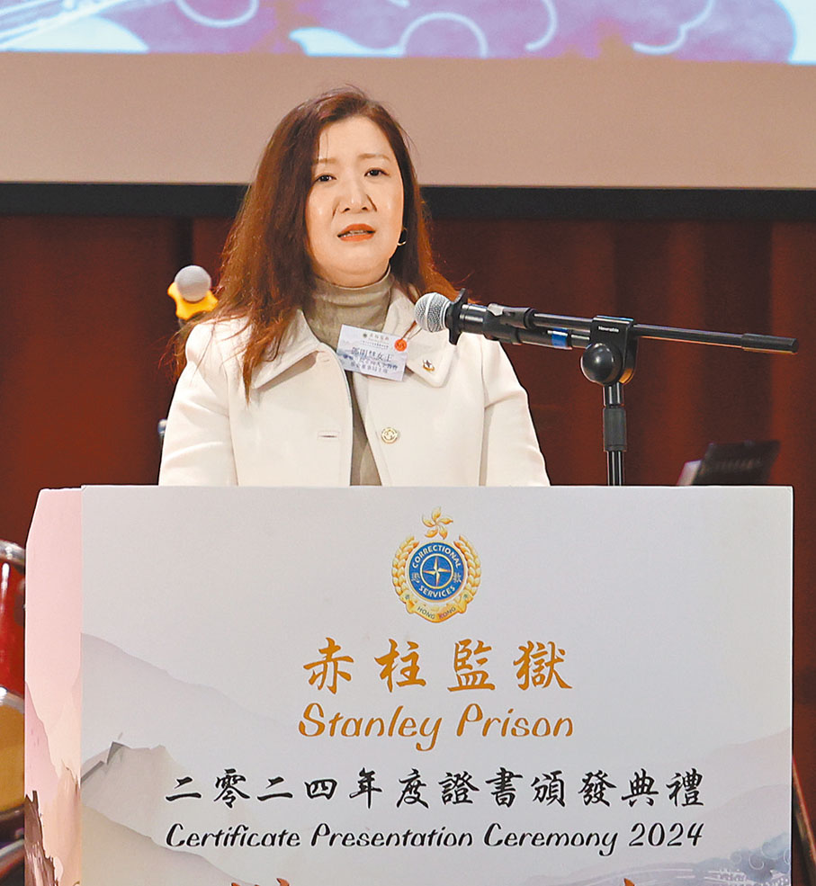 特區政府懲教署轄下赤柱監獄昨日舉行年度證書頒發典禮,向38名在囚者頒發學業證書。他們共考獲67卷合格成績,其中36卷為優良,當中一人獲都大頒授通識教育博士學位,一人獲學士學位,兩人獲頒副學士學位。非政府機構及社區團體代表、社會賢達,以及在囚者家屬百多人出席見證。
