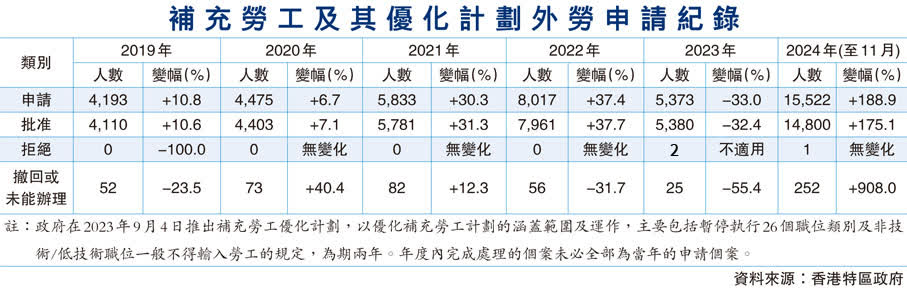 截至2024年11月底,香港補充勞工優化計劃已批出37,500個配額,加上行業計劃共批出58,000個配額,緩解了多個行業人手短缺。目前輸入外勞的合法渠道,是由香港僱主向勞工處申請配額,之後親自或經職業介紹所,向全國合法的14間勞務公司在各省市招募人手。