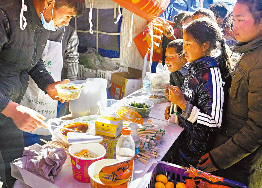 天還沒亮時,在此救災的中國人民解放軍西藏軍區某團後勤人員已在簡易灶台上煮雞蛋、熬排骨粥。「我們負責給古榮村安置點災民、工作人員等提供熱食。」後勤負責人和春說,他們準備了一周的應急物資,後續可隨時補充。