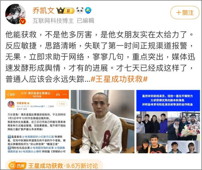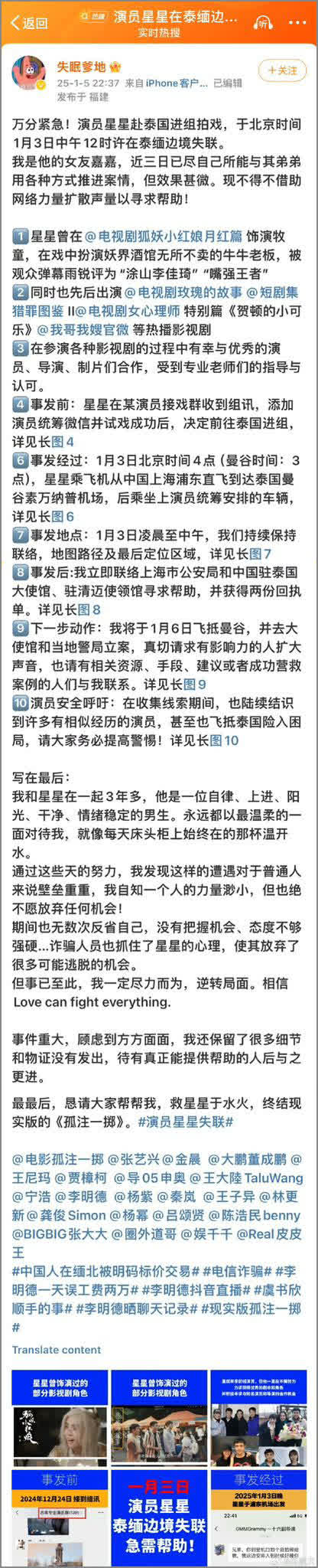 4、在報警後等待兩天無果後,經過深思熟慮,她選擇合理利用網絡輿論,把星星演過的作品和合作過的明星一一列舉,成功擴大了聲援的力量。最後抵達泰國曼谷在當地報警並進行信息採集,尋求大使館求助,推動營救進展。
