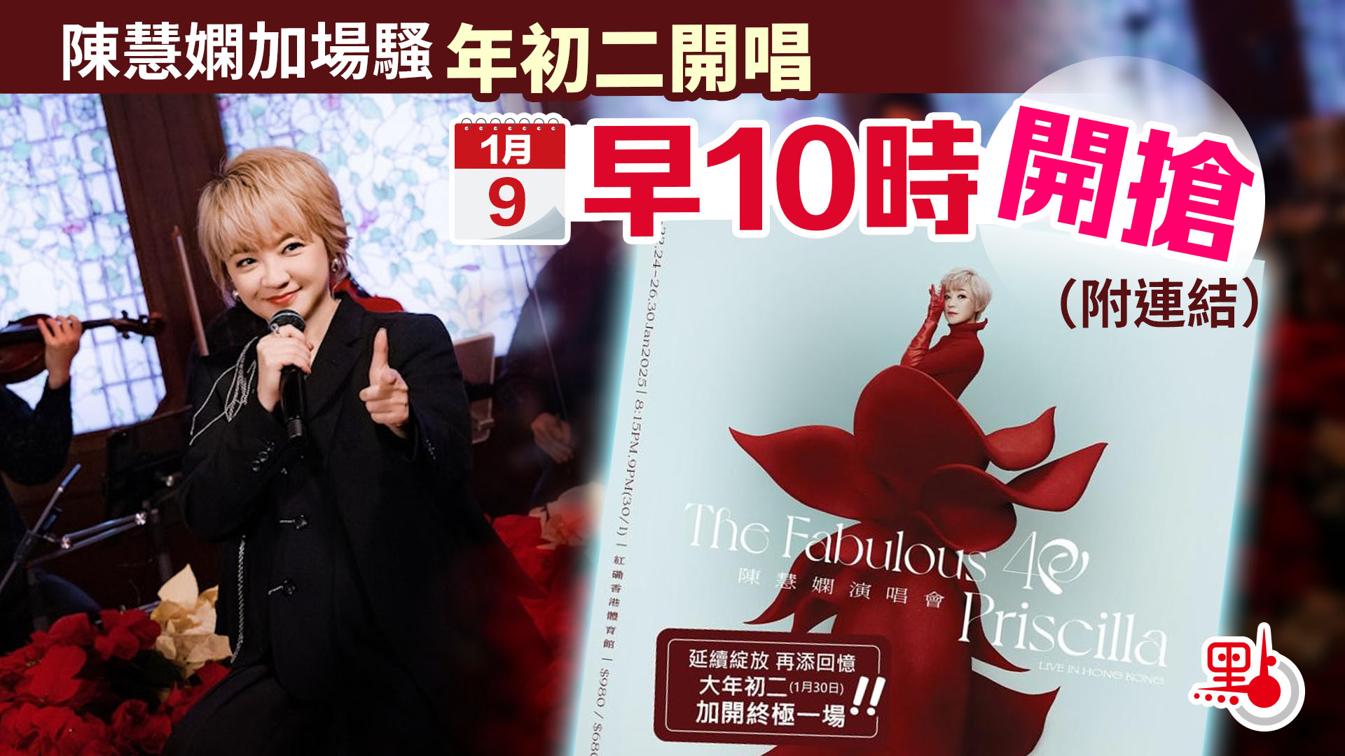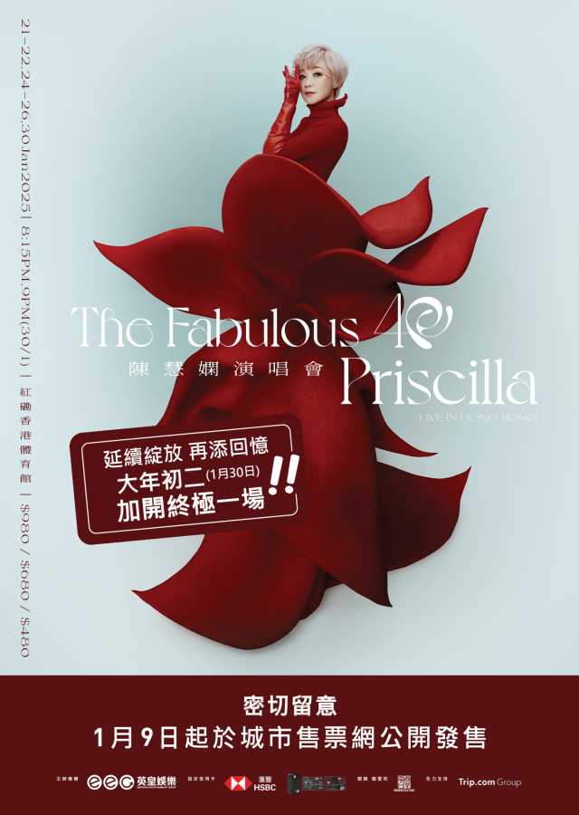 大公文匯全媒體報道,出道40周年的陳慧嫻,將於今年1月底舉行《The Fabulous 40 Priscilla LIVE IN HONG KONG陳慧嫻演唱會》,第六度踏上紅館舞台。去年11月底公開售票后,反應熱烈,大會宣布加場,在1月30日(大年初二)跟大家在紅館開年。城市售票網及Trip.com會於1月9日早上10時發售門票。