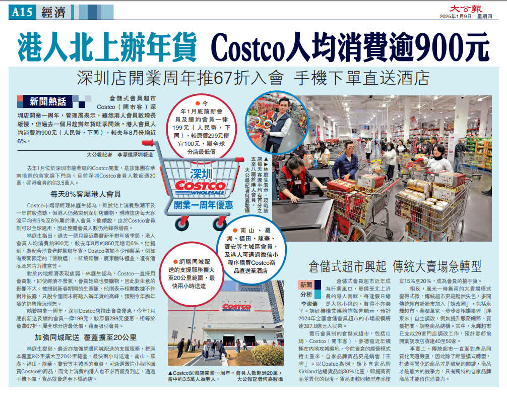 Costco市場部經理林庭生認為,雖然北上消費熱潮不及一年前般強勁,但港人仍熱衷到深圳店購物,現時該店每天客流平均有5%至8%屬於港人會員。他續說,由於Costco會員制可以全球通用,因此整體會員人數仍然錄得增長。