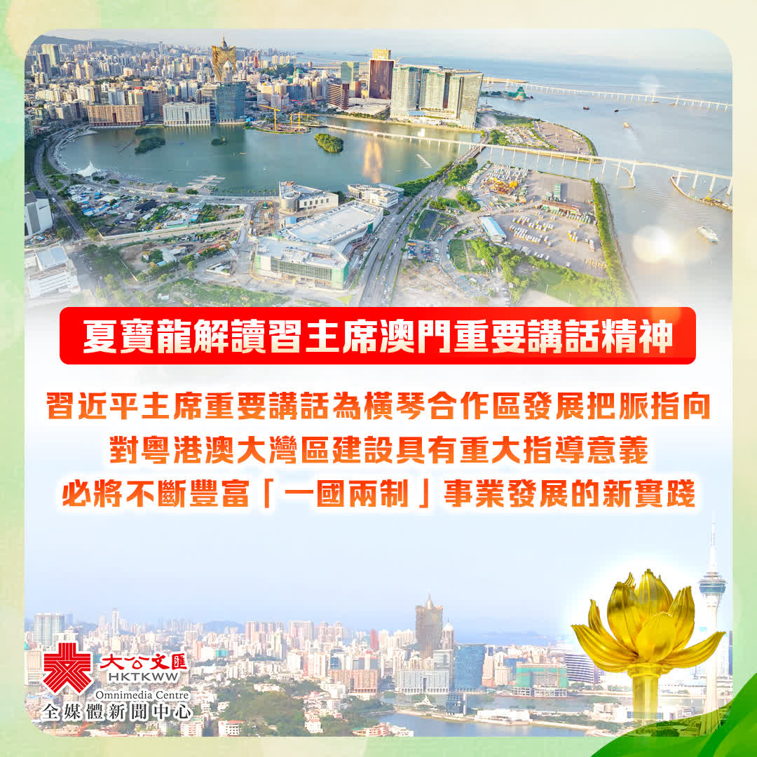 習近平主席對橫琴開發念茲在茲,傾注大量心血,這已經是第五次親臨橫琴視察。習近平主席重要講話,專門重申開發橫琴的初心,強調「中央決定開發橫琴,目的就是促進澳門經濟適度多元發展、便利澳門居民生活就業。這個定位要把握好,不能發展一些與這個定位不一致的產業項目」。開發橫琴,這是中央為澳門長遠發展開出的一劑「良方」,是為澳門經濟適度多元發展量身定做的。這個定位必須牢牢把握,絲毫不能動搖。習近平主席指出,「『澳門+橫琴』正在成為豐富『一國兩制』實踐的新示範、推動粵港澳大灣區建設的新高地、實現國家高水平對外開放的新平台」。這些重要論述,充分體現了習近平主席對橫琴開發建設、澳門經濟適度多元發展的殷切期盼,對香港、澳門更好參與粵港澳大灣區建設具有很強的現實指導意義。