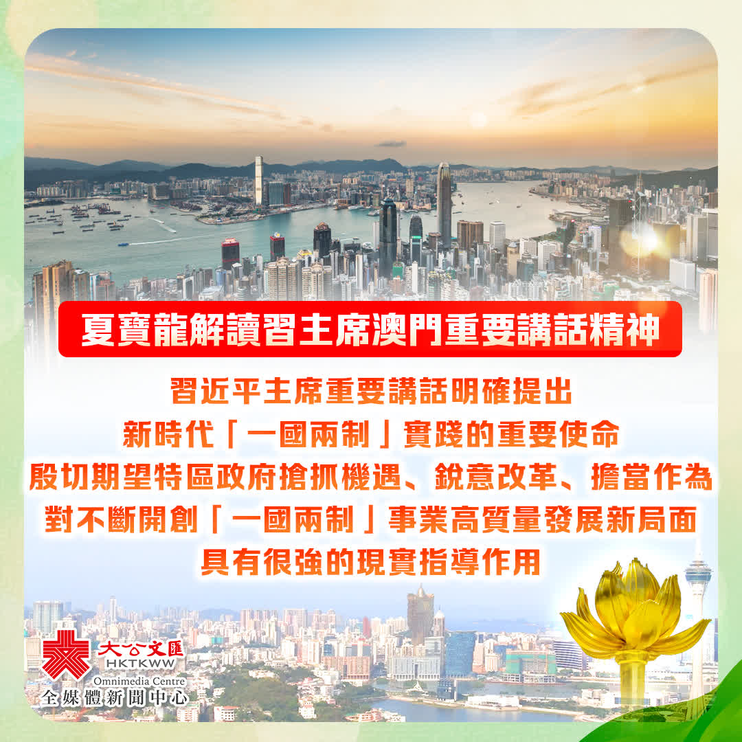 習近平主席重要講話,明確指出「實現香港、澳門更好發展,為強國建設、民族復興作出更大貢獻,是新時代『一國兩制』實踐的重要使命」。這一重要論述,在以中國式現代化全面推進強國建設、民族復興偉業的歷史卷軸上標註了「一國兩制」實踐的時代坐標,飽含着對香港、澳門的殷切期待。習近平主席對澳門特別行政區政府和社會各界提出「3點期許」和「4點希望」,這些重要指示精神同樣適用於香港。希望香港、澳門特別行政區政府和社會各界牢記囑託,順應時代發展潮流,主動識變應變求變,更好發揮「一國兩制」制度優勢,加強港澳兩地互學互鑒、交流合作,不斷打開香港、澳門發展新天地。