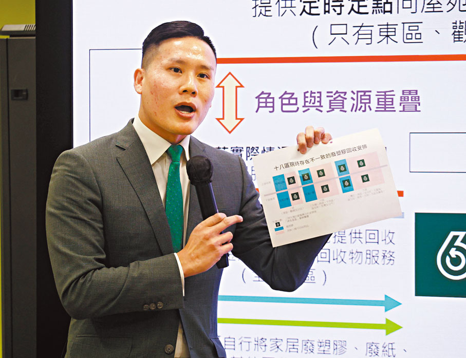 黃智華昨日解釋,先導計劃範圍很窄,只局限於處理東區、觀塘及沙田3區廢膠上下游回收及另外6區的下游回收,即先導計劃下3間營辦商到屋苑只回收廢塑膠,「綠在區區」營辦商又要再多出一輛車到屋苑回收其餘8種回收物,坦言「有時就算沒有回收物(廢塑膠)都要出車,明顯資源重疊」。