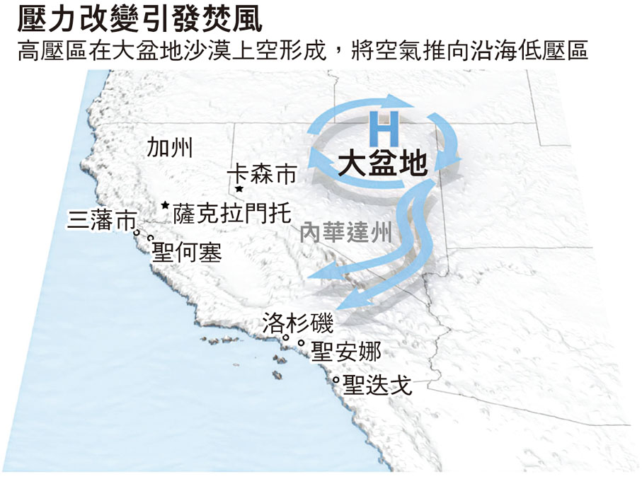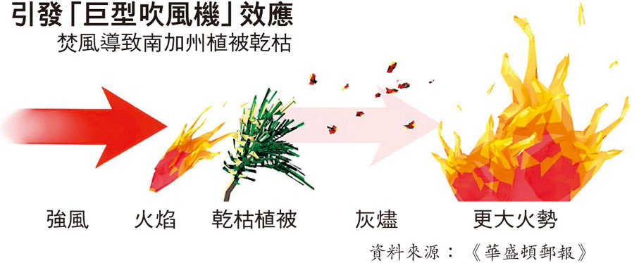 加州南部的山火在以往並不罕見,但今次規模和火勢都特別嚴重。英國《衛報》報道,美國西部沙漠地區颳起的乾燥大風會吹至沿海的南加州,這在加州較冷的月份相當常見,這種乾燥大風稱為「聖安娜焚風」,令南加州的植物乾枯,加上南加州濕度下降,乾燥植被更易被點燃。