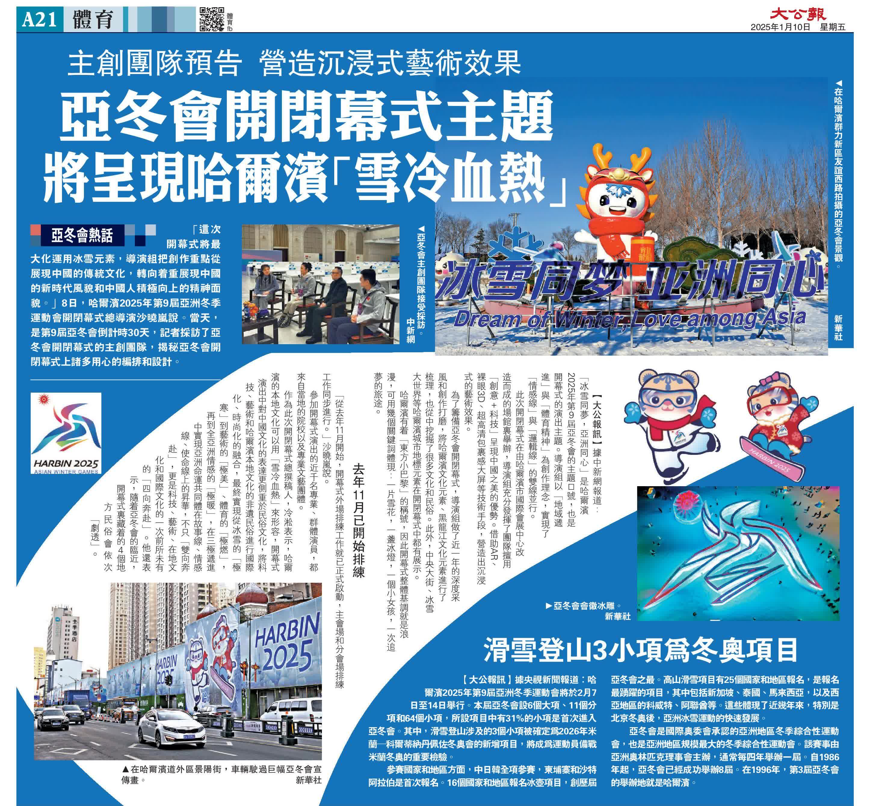大公報綜合報道,「這次開幕式將最大化運用冰雪元素,導演組把創作重點從展現中國的傳統文化,轉向着重展現中國的新時代風貌和中國人積極向上的精神面貌。」1月8日,哈爾濱2025年第9屆亞洲冬季運動會開閉幕式總導演沙曉嵐說。當天是第9屆亞冬會倒計時30天,記者採訪了亞冬會開閉幕式的主創團隊,揭秘亞冬會開閉幕式上諸多用心的編排和設計。