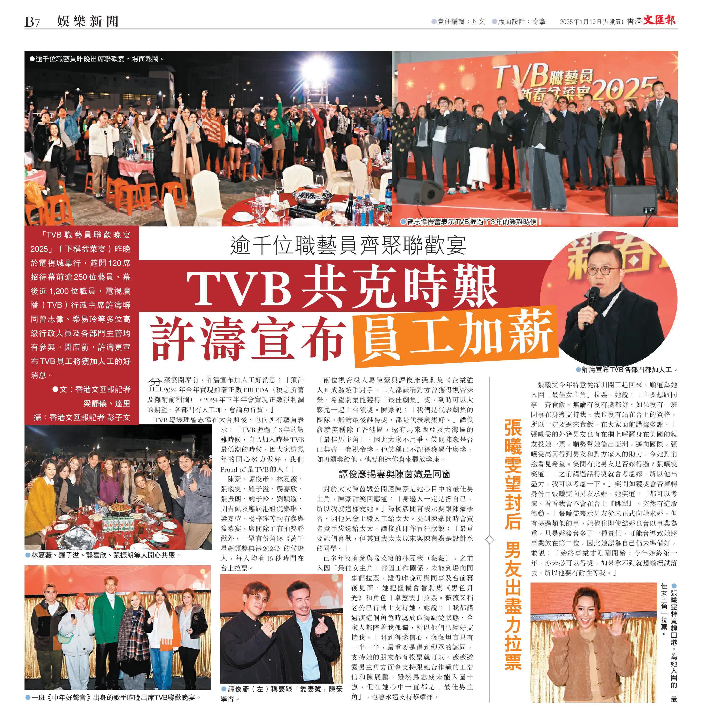 (香港文匯報 記者 梁靜儀、達里)「TVB職藝員聯歡晚宴2025」(下稱盆菜宴)昨晚於電視城舉行,筵開120席招待幕前逾250位藝員、幕後近1,200位職員,電視廣播(TVB)行政主席許濤聯同曾志偉、樂易玲等多位高級行政人員及各部門主管均有參與。開席前,許濤更宣布TVB員工將獲加人工的好消息。